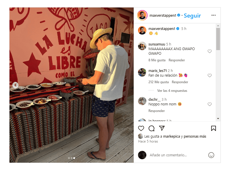 Las vacaciones de verano en la Fórmula 1 (F1) están llegando a su fin, y el piloto neerlandés Max Verstappen aprovechó la oportunidad para compartir fotografías de cómo disfrutó su tiempo libre, lejos de la velocidad y la adrenalina de las pistas.Hoy martes, el actual líder y tricampeón del mundo publicó imágenes de lo que fue su receso, las cuales dieron mucho de qué hablar en las redes sociales.En la primera postal se ve al piloto de Red Bull posando junto a su novia, Kelly Piquet.En la segunda, se puede ver a Max persiguiendo a un perro en la arena.En la tercera, el neerlandés presume un platillo mexicano que comió en estos días; en la imagen se ve una mesa cubierta de varios sabores de tacos, y detrás, se puede leer un mural con la leyenda: "La lucha libre es como el taco".Esta última foto desató múltiples reacciones, sobre todo, de sus seguidores mexicanos, quienes lo tomaran como un gran gesto por parte del número 1 de la parrilla, mientras que otros han señalado que es la culpa del jalisciense Sergio "Checo" Pérez, debido a que ha sido su coequipero en Red Bull durante los últimos años.No es la primera vez que Verstappen degusta comida mexicana, pues en algunas dinámicas junto al tapatío Pérez, sobre todo cuando están en el Gran Premio de la Ciudad de México, el europeo ha comido tacos e incluso ha expresado que sus favoritos son los de al pastor.La F1 regresará este domingo 25 de agosto con el Gran Premio de Países Bajos, y con un ingeniero interino, Checo buscará revertir la mala racha e iniciar con buen paso el cierre del presente campeonato.Por su parte, Max Verstappen buscará mantenerse para cerrar con otro título de la máxima categoría del automovilismo en las vitrinas.*Mantente al día con las noticias, únete a nuestro canal de WhatsAppOF