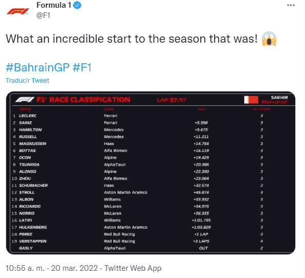 La nueva temporada de la Fórmula 1 comenzó de pésima forma para Red Bull, pues a pesar de que Max Verstappen y Sergio "Checo" Pérez pelearon por el podio hasta el final, ambos pilotos abandonaron durante las últimas vueltas del Gran Premio de Baréin.Con un Charles Leclerc dominante y un Carlos Sainz que no desentonó, Red Bull encontró en los de Maranello a los que prometen ser sus nuevos rivales por el campeonato, pues Ferrari hizo el 1-2 en Sakhir mientras que Lewis Hamilton de Mercedes se quedó con un tercer lugar que le cayó del cielo.Con el abandono de Verstappen debido a problemas con el motor, fue "Checo" Pérez quien se ubicó en el tercer lugar, y a pesar de que estaba a media vuelta para concluir la carrera, el mexicano comenzó a perder potencia y a la postre dio un trompo en la curva dos que lo dejó fuera de cualquier posibilidad de meterse a los puestos de honor.Ante esta situación, Hamilton no tuvo problema para rescatar un podio que parecía perdido, y Red Bull, quien había peleado codo a codo con Ferrari durante toda la carrera, se fue con las manos vacías y con mucho por trabajar en el RB18 si es que quieren competirle a un cavallino rampante que amenaza con recobrar la cima de la máxima categoría del automovilismo.Con este triunfo de Leclerc, la escudería italiana cortó su larga racha sin conseguir un triunfo, pues desde el 2019 que Ferrari no ganaba una carrera en la Fórmula 1.GC