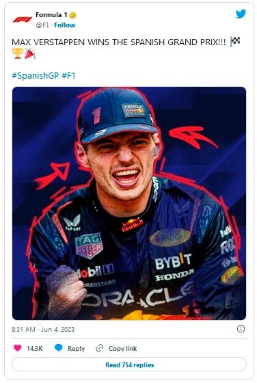 No hay quién lo pare. El piloto neerlandés de Red Bull, Max Verstappen, sigue intratable y en una carrera tranquila para él, en la que dominó de punta a punta, se llevó la victoria en el Gran Premio de España celebrada en el Circuito Barcelona-Cataluña, en Montmeló, España, octava parada en el campeonato de Fórmula 1.El piloto mexicano, Sergio “Checo” Pérez, por su parte, terminó en el cuarto lugar luego de haber arrancado en el puesto 11, por lo que remontó siete posiciones y por más que intentó meterse al podio luego de todas las estrategias, simplemente le faltó tiempo para poder dar el salto al podio. Pérez Mendoza mejoró sustancialmente lo hecho la semana pasada, cuando cometió una infinidad de errores en Mónaco y ahora en el Gran Premio de España todo cambió, el tapatío se concentró, el equipo entendió que debían mejorar la estrategia de neumáticos y por poco les sale en el sentido de meter a “Checo” dentro de los tres mejores pilotos de la carrera.Con este resultado de carrera, la escudería austriaca Red Bull Racing sigue en el 1-2, y es que Max Verstappen sigue a la cabeza en el campeonato mundial de pilotos en esta temporada 2023 de la Fórmula 1 con 170 puntos y va encaminado a un título más; por su parte, el mexicano Sergio Pérez Mendoza llega a 117 unidades luego de su cuarto lugar en España, mientras que el asturiano Fernando Alonso de Aston Martin llega a 99 puntos y se mantiene en el tercer puesto.La siguiente parada de la máxima categoría del automovilismo será dentro de dos semanas, cuando se dispute el Gran Premio de Canadá en el Circuito Gilles Villeneuve en Montreal, Quebec el próximo domingo 18 de junio.1.- Max Verstappen / Red Bull 2.- Lewis Hamilton / Mercedes 3.- George Russell / Mercedes 4.- Sergio Pérez / Red Bull 5.- Carlos Sainz / Ferrari 6.- Lance Stroll / Aston Martin 7.- Fernando Alonso / Aston Martin 8.- Esteban Ocon / Alpine 9.- Guanyu Zhou / Alfa Romeo 10.- Pierre Gasly / AlpineJM
