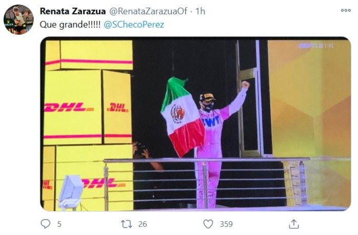 Tuvieron que pasar 50 años para que un mexicano volviera a ocupar lo más alto del podio en la Fórmula 1, pero este domingo, Sergio “Checo” Pérez lo logró y con una carrera y manejo espectacular de llevó el primer puesto del Gran Premio de Sahkir.Ante este triunfo, el mundo del deporte se ha rendido al tapatío y celebrado su triunfo en las redes sociales.El piloto Adrián Fernández celebró a Pérez en Twitter:“Aún no he visto la F1, pero me estoy enterando del gran triunfo de Checo Pérez. Qué les puedo decir... este cab... es un verdadero guerrero y se merece esto y más. Red Bull Racing, qué están esperando! Checo me siento muy orgulloso de ti y contento por tu familia. Bravo”.Patricio O’Ward, piloto de Indy, público:“SERGIO PEREZ GANADOR DEL #SakhirGP !!!!!! P*nche carrerota de ANIMAL QUE TE AVENTASTE!!! Guau guau guau!!! #f1”La tenista mexicana Renata Zarazua mandó también su felicitación al mexicano con un “Qué grande!!!!!!”, acompañado de una fotografía de Pérez en el podio.El piloto británico, que peleó el podio con Checo y sustituyó a Lewis Hamilton, George Russel, también envío un mensaje en su Twitter en el que dijo que “nadie merece una victoria más que él”.IM