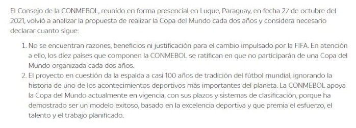 La Confederación Sudamericana de Fútbol (Conmebol) le dijo este miércoles "no" a la celebración de un Mundial cada dos años, como propone llevar a cabo la FIFA a partir de 2023.En un comunicado emitido por el ente rector del fútbol sudamericano, los 10 países integrantes del Consejo, reunidos presencialmente en Luque (Paraguay), "se ratifican en que no participarán de una Copa del Mundo organizada cada dos años"."No se encuentran razones, beneficios ni justificación para el cambio impulsado por la FIFA", argumenta la declaración de la Conmebol.Según el comunicado, el proyecto defendido por la FIFA "da la espalda a casi 100 años de tradición del fútbol mundial, ignorando la historia de uno de los acontecimientos deportivos más importantes del planeta".La Conmebol "apoya la Copa del Mundo actualmente en vigencia, con sus plazos y sistemas de clasificación, porque ha demostrado ser un modelo exitoso, basado en la excelencia deportiva y que premia el esfuerzo, el talento y el trabajo planificado", concluye el texto.En el último mes, el presidente de la FIFA, Gianni Infantino, efectuó una gira por varios países latinoamericanos, durante la que defendió, en varios foros, su propuesta de celebrar un Mundial cada dos años.En opinión del dirigente, esa medida generaría "más competición de alto nivel, más esperanza y emoción y más posibilidad al mundo de poder organizar también unos mundiales"."Si no, antes de que vuelva un Mundial a un continente pasan 24 años si queremos hacer una verdadera rotación, y 24 años es más que una generación de gente", argumentó en su visita a Argentina el mandatario de la FIFA, para quien en los últimos años se "habló demasiado de clubes" y "nunca se pone sobre la mesa la selección nacional".El primer Mundial de fútbol de la historia se celebró en 1930 en Uruguay. La Copa del Mundo solo fue interrumpida en dos ocasiones, con motivo de la Segunda Guerra Mundial, por lo que de 1938 se pasó a 1950.En 2022 se disputará en Qatar la vigésima segunda edición de la Copa del Mundo, con la participación de 32 selecciones, que se ampliarán a 48 en 2026, cuando se juegue en Estados Unidos, Canadá y México. JL