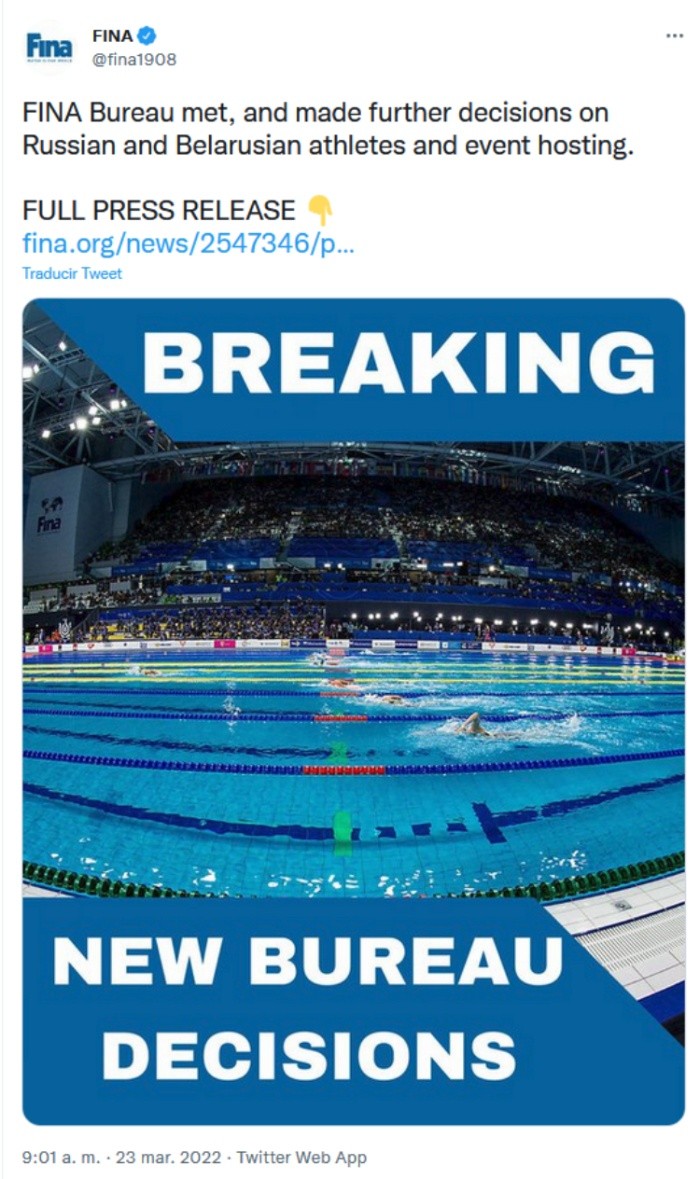 Este miércoles 23 de marzo, la Federación Internacional de Natación (FINA) anunció la exclusión de los nadadores rusos y bielorrusos, así como de todos sus funcionarios, para el próximo Mundial que se celebrará en Budapest entre el 18 de junio y el 3 de julio de 2022.Mediante un comunicado oficial, el organismo presidido por el kuwaití Husain Al-Musallam informó de que, a raíz de su decisión, la Federación Rusa de Natación retirará a todos sus atletas acuáticos de todos los eventos organizados por la FINA que tienen que disputarse en 2022.Además, anunció el retiro de la organización de los campeonatos del mundo a la localidad rusa de Kazán que se disputará en un lugar aún indeterminado en las mismas fechas: entre el 17 y el 22 de diciembre.Asimismo, el ejecutivo de la FINA decidió abrir un procedimiento contra el nadador ruso Evgeny Rylov "por una posible violación de las normas" tras su "presunta" participación en una manifestación a favor de la invasión de Ucrania en el estadio Luzhniki de Moscú.Por último, reiteró su "más enérgica condena" de la invasión rusa de Ucrania e insistió en su compromiso de apoyar a la Federación de Natación, Buceo y Natación Artística de Ucrania en su preparación de las próximas competiciones.OF