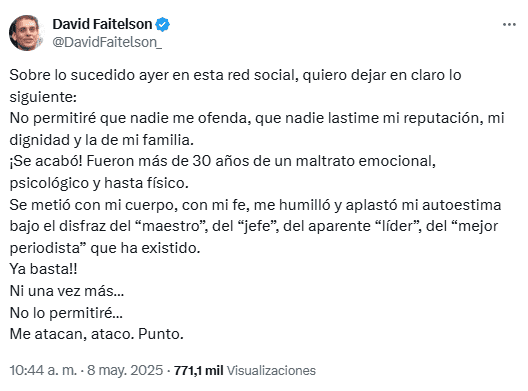 David Faitelson se defendió ayer en su perfil en redes sociales tras una dura crítica de José Ramón Fernández, revelando que su exjefe en ESPN y TV Azteca sufrió en algún tiempo problemas de adicción.La acusación causó gran escándalo en el medio periodístico deportivo y entre los usuarios de redes sociales; sin embargo, el hoy comentarista de TUDN siguió con la polémica esta mañana."Sobre lo sucedido ayer en esta red social, quiero dejar en claro lo siguiente: No permitiré que nadie me ofenda, que nadie lastime mi reputación, mi dignidad y la de mi familia. ¡Se acabó!", escribió Faitelson en X.Faitelson justificó su reacción y señaló que no volverá a permitir más daño psicológico y hasta físico de nadie. El escandaloso periodista de Televisa aseguró que José Ramón Fernández lo afectó por más de 30 años."Fueron más de 30 años de un maltrato emocional, psicológico y hasta físico. Se metió con mi cuerpo, con mi fe, me humilló y aplastó mi autoestima bajo el disfraz del 'maestro', del 'jefe', del aparente 'líder', del 'mejor periodista' que ha existido", agregó."Ya basta. Ni una vez más…No lo permitiré…Me atacan, ataco. Punto", concluyó de forma contundente.David Faitelson y José Ramón Fernández se enfrascaron en una discusión en redes sociales, cuando el ahora comentarista de Televisa respondió a una. José Ramón Fernández lo llamó "sicario" en un programa de ESPN, señalándolo por tener un conflicto de intereses por trabajar en Televisa y ahora "atacar" a Grupo Pachuca, empresa que le pagó un viaje a Europa."Usted se refiere a mí como 'sicario', una palabra muy dura en los tiempos que vive el país. Siento mucho que sea tan irresponsable. Debe ser la edad. Ahora bien, quizá, se le venga a memoria lo de 'sicario' por aquellos graves problemas que tuvo usted con el consumo de cocaína en la parte final de su estadía en TV Azteca. Recuerde que fue tan grave que el dueño de la empresa lo separó del cargo y lo envió a usted y a su señora esposa, con todo pagado, a España para intentar que se recuperara. Espero que en realidad se haya recuperado. Es lo único que podría entenderse en la relación con la palabra 'sicario'", dijo Faitelson. *Mantente al día con las noticias, únete a nuestro canal de WhatsAppOF