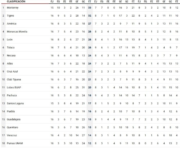 El Torneo Apertura 2017 está en su etapa más emocionante, queda solamente una jornada por disputarse, la cual será dentro de dos semanas, ya que se atraviesa una Fecha FIFA en donde el Tricolor disputará un par de cotejos amistosos en Europa, por ende, la Liga MX tendrá una semana de descanso y los equipos que buscan un pase a la Liguilla tendrán más tiempo de preparación y los que no tienen esa chance, tienen más tiempo de agonía.A falta de 90 minutos para cada escuadra, los equipos que están oficialmente clasificados a la Fiesta Grande son Monterrey (33 puntos), Tigres (32 puntos) y América (27 puntos), aunque si hoy hubiera terminado ya el certamen, los otros equipos clasificados serían Morelia, León, Toluca, Necaxa y Atlas. Aunque todavía hay equipos, como Cruz Azul y Tijuana, que intentan a toda costa colarse entre los invitados a la Fiesta.Por su parte, Morelia, León y Toluca tienen prácticamente asegurado ese pase a la búsqueda del título del Apertura 2017, y una verdadera catástrofe haría que se quedaran sin su boleto, sin embargo en el futbol mexicano todo puede pasar y tienen que pasar esos 90 minutos para que se pueda saber quiénes serán los ocho invitados, habiendo ya tres con boleto amarrado.Quienes tendrán que ver la Liguilla desde la comodidad de su hogar, son Lobos BUAP, Pachuca, Santos, Puebla, Chivas, Querétaro, Veracruz y Pumas, estos equipos fracasaron en su intento de acceder al mini torneo que entrega el título del futbol azteca.Con el futuro en sus manosLa historia dicta que cuando los Zorros tienen el futuro en sus manos para así meterse a la Liguilla, suelen tener problemas y cerrar “a lo Atlas” los torneos, sin embargo en este Apertura 2017, sobre todo en el cierre, han demostrado que tienen mayor manejo de partido y sobre todo contundencia en la figura de Milton Caraglio, que podría llevar a los rojinegros a una nueva Liguilla.Para que los pupilos del “Profe” Cruz se metan a la Fiesta Grande, deben derrotar, simple y sencillamente, a los Tuzos del Pachuca, que llegan a este partido ya eliminados y pensando en el Mundial de Clubes, en caso de que los tres puntos no lleguen para los Zorros, deberán echar un vistazo a lo que ocurra en el Estadio Azul entre La Máquina y Veracruz, esperando que los Cementeros no se lleven el triunfo.Algo que puede ayudar al Atlas es que la motivación se encuentra a tope, luego de vencer apenas hace unos días a las Chivas en el Clásico Tapatío, además de que a media semana consiguieron empatar ante uno de los equipos más poderosos de la Liga, los Tigres.LOS EQUIPOSMonterrey Ya están clasificados, para mantener el liderato general deberán derrotar a Santos Laguna en el partido pendiente; en caso de que esto no ocurra, deben empatar con Tigres en la Fecha 17.Tigres Con el boleto en la bolsa, los felinos aspiran al liderato general, para lo cual necesitan que Monterrey no gane a Santos en su juego pendiente y luego vencerlos en el Clásico Regio.América Las Águilas tienen el boleto en la bolsa, sin embargo para mantener el tercer lugar general que presumen, deben derrotar en la última jornada a Santos Laguna para no ser alcanzados.Morelia Con el empate ante Necaxa están adentro, pero si pierden tendrán que esperar las derrotas del León, Toluca, Atlas o Cruz Azul; de los dos últimos conjuntos también le sirve el empate. León La victoria ante Chivas lo mete directo a la Fiesta Grande, en caso de empatar o perder tendrá que aguardar a que Necaxa, Atlas o Cruz Azul no ganen.Toluca Ganando en casa ante Tijuana estarán en la Liguilla, un resultado diferente lo obligará a rezar para que los Rayos, rojinegros y La Máquina no sumen unidades.Necaxa Si logra el triunfo ante Morelia no dependerá de ningún otro resultado; si empata requiere que Atlas, Cruz Azul y Toluca no sumen de a tres en el último partido del torneo.Atlas Los Zorros se metieron de lleno a zona de calificación y dependen de sí mismos para avanzar, si empatan o pierden ante Pachuca deben esperar la caída de Cruz Azul.Cruz Azul Está obligado a ganar a Veracruz, si lo hace está dentro pase lo que pase en los otros frentes, si empata, necesita que Atlas y Necaxa pierdan sus compromisos para acceder a la Liguilla.Xolos El cuadro fronterizo busca lo imposible, sumar tres, ganar por más de ocho goles y esperar que ni Atlas, Cruz Azul o Necaxa sumen en sus respectivos partidos.CLASIFICACIÓN Tabla general