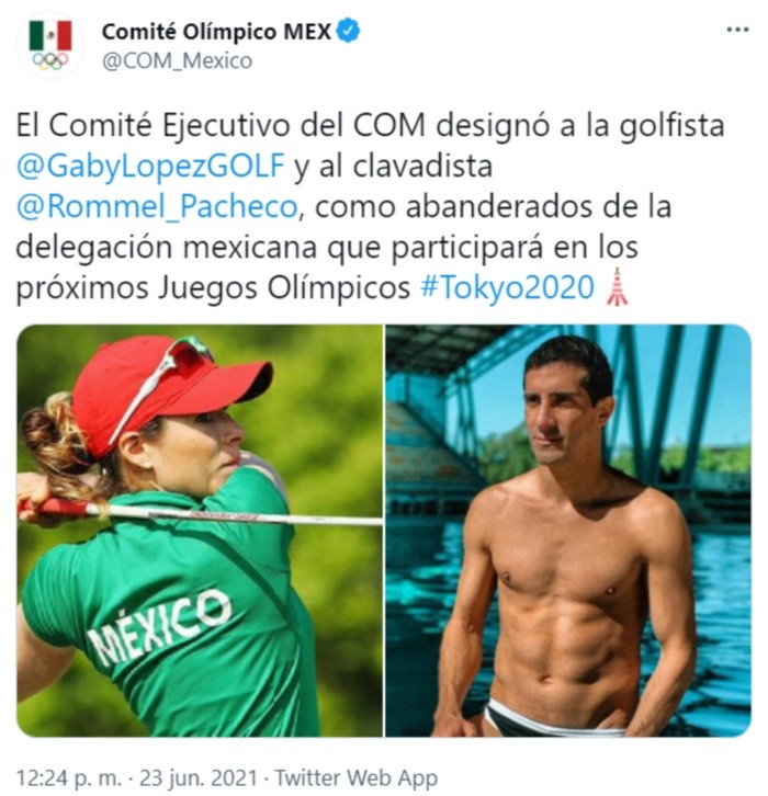 Este miércoles, el Comité Ejecutivo del Comité Olímpico Mexicano designó a la golfista Gaby López y al clavadista Rommel Pacheco como los abanderados de la delegación mexicana que participará en los Juegos Olímpicos de Tokio 2020.La noticia la dio a conocer el COM con un comunicado difundido a través de sus redes sociales. ''Por acuerdo del Comité Ejecutivo del Comité Olímpico Mexicano (COM) se designó a los atletas María Gabriela López Butron (golf) y a Rommel Aghmed Pacheco Marrufo (clavados) como los abanderados de la Delegación Mexicana que participará en los Juegos Olímpicos de Tokio 2020''.''Lo anterior fue informado por el presidente del COM, Carlos Padilla Becerra, al término de la reunión que tuvo lugar hoy de manera virtual (vía zoom), donde de manera unánime se aprobó otorgarle tal distinción a los atletas mencionados'', dice el texto.El COM resalta el trabajo profesional de los atletas. Sobre Gaby López señala que fue integrante del primer equipo All American 2013, 2014 y 2015. Tres veces campeona colegial, Top-10 del Mundo como Amateur, y que en sus seis años compitiendo en la élite de la Ladies Professional Golf Association (LPGA, por sus siglas en inglés), ha participado en los Juegos Olímpicos de Río 2016, ha conseguido dos títulos (Blue Bay LPGA 2018, Tournament of Champions 2020), y ha sido campeona en el torneo de Orlando, Florida, por la LPGA 2020, entre otros logros.Sobre Rommel Pacheco, indica que como miembro de la Secretaría de la Defensa Nacional (Sedena), fue miembro de la Comisión de Atletas del Comité Olímpico Mexicano; como atleta ha ganado medalla de plata en trampolín tres metros en la Serie Mundial de Clavados de Sagamihara 2019, Beijing 2019, Montreal 2019 y en el Campeonato Mundial Gwangju 2019, y además ha sido medallista en Campeonatos Mundiales, Copas del Mundo, Series Mundiales, Juegos Panamericanos y Juegos Centroamericanos y del Caribe.''Creemos que nuestros atletas cuentan con las trayectorias deportivas y calidad humana que apoyan esta distinción. Sabemos que además serán un referente de la Delegación Mexicana en la máxima justa deportiva'', mencionó Padilla Becerra.Los Juegos Olímpicos de Tokio se llevarán a cabo del 23 de julio al 8 de agosto.OF