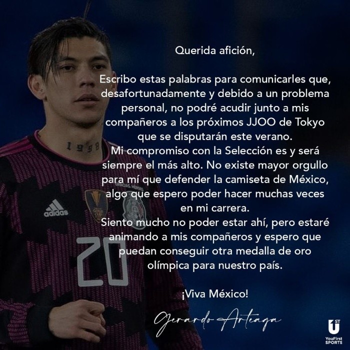 Las malas noticias para la Selección Mexicana y en específico para Jaime Lozano se siguen haciendo presentes.Y es que, Gerardo Artega, lateral izquierdo, causa baja y no asistirá a los Juegos Olímpicos de Tokio 2020.Con esto, se consuma la segunda baja para el representativo mexicano, luego de que José Juan Macías sufriera una lesión.La gente de Selección subió un comunicado, en donde indica que el motivo de la baja del jugador del Genk de Bélgica, se debe a motivos personales.Además, citaron una declaración del lateral mexicano donde le desea lo mejor a sus compañeros: "Aunque hoy no pueda estar presente mi corazón está siempre con Mexico y la Selección. Les deseo lo mejor a mis compañeros", comentó Arteaga.Ante esto, el que reemplazará al canterano de Santos será Vladimir Loroña, jugador de Xolos de Tijuana y que repotará de inmediato con la Selección que se encuentra en Nashville.Loroña, de 22 años, fue uno de los jugadores más constantes del conjunto fronterizo en el Guardianes 2021, ya que disputó 16 de los 17 partidos de la temporada, en quince de ellos como titular. AJ