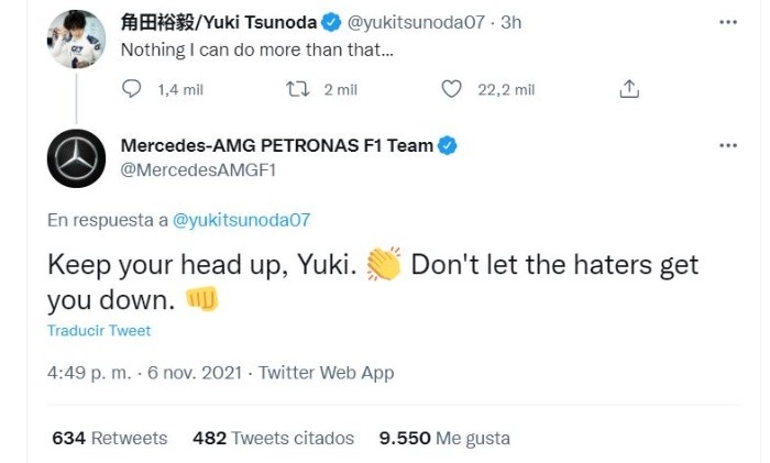 El piloto Yuki Tsunoda intentó defenderse en Twitter, luego de que los miembros de la escudería Red Bull aseguraran que él fue el responsable de su mal resultado en la clasificación, sin embargo las cosas no salieron como él esperaba.El japonés publicó en su cuenta un mensaje: "nada que pueda hacer más que eso..." e inmediatamente comenzó a recibir respuestas de varios usuarios que lo insultaban o criticaban sus habilidades al volante.Al ver eso, la escudería Mercedes no dudó en enviar un mensaje de apoyo para el novato de la Fórmula Uno: "Mantén tu cabeza en alto, Yuki. No permitas que los 'haters' te desanimen".Esta acción fue aplaudida por varias personas que aseguraban que la alemana es la escudería con más "clase" dentro de la Fórmula Uno y que además, criticaban a Horner por haber culpado a Yuki del resultado de la calificación.Cabe recordar que los pilotos de Mercedes, Valtteri Bottas y Lewis Hamilton saldrán en primer y segundo lugar respectivamente el día de mañana, mientras que los de Red Bull ocuparán el tercer (Verstappen) y cuarto lugar (Pérez).La carrera dará inicio mañana a las 13:00 horas en la pista del Autódromo Hermanos Rodríguez.JL