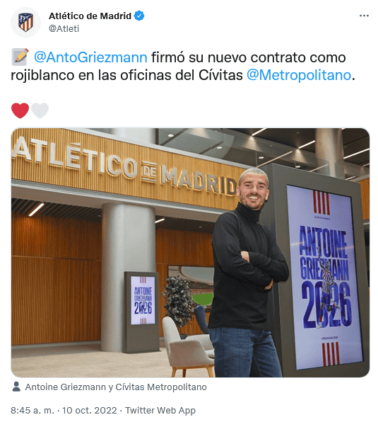 El Atlético de Madrid hizo oficial hoy lunes el fichaje hasta 2026 del delantero francés Antoine Griezmann, quien se encontraba cedido por el Barcelona en el club rojiblanco."El Atlético de Madrid y el FC Barcelona han llegado a un acuerdo para el traspaso de Antoine Griezmann, quien desde verano de 2021 y hasta la fecha había militado en nuestro club como cedido por la entidad azulgrana", afirmó el Atlético en un comunicado.El club colchonero precisa que Griezmann "ha suscrito un contrato que le vinculará con nuestra entidad hasta el 30 de junio de 2026".El Atlético no revela el precio de la operación, pero el presidente del Barcelona, Joan Laporta, había afirmado el domingo en una asamblea de socios, que el traspaso es "por 20 millones (de euros, 19.4 millones de dólares) fijos, más cuatro (3.8 millones de dólares) en variables de fácil cumplimiento"."Además, si el Atlético lo vendiera, nos pagaría la diferencia hasta llegar a los 40 millones de euros (38.8 millones de dólares)", añadió Laporta.Esos 40 millones de euros eran los que estaban previstos, inicialmente, en el acuerdo de cesión del internacional francés.OF