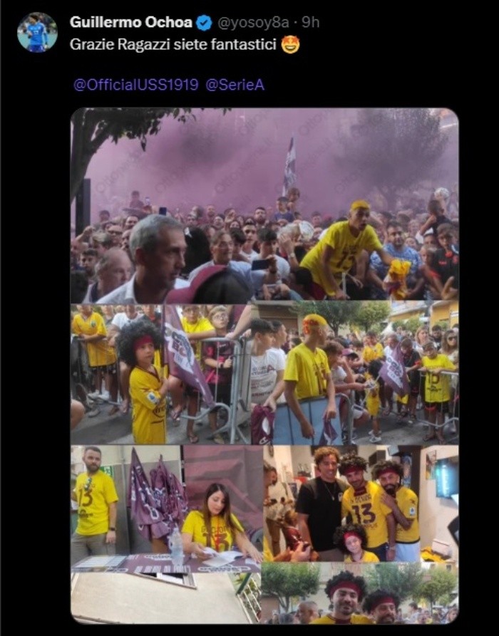 El guardameta mexicano, Guillermo Ochoa, vivió su primer semestre defendiendo el arco del Salernitana de la Serie A de Italia, donde se ha convertido en un referente del equipo y para claro ejemplo el club de fans que acaba de estrenar."Ochoa's boys fan club" es el nombre de la agrupación que dicen ser los admiradores número uno de "Memo" Ochoa.En las imágenes que el propio arquero de la Selección Mexicana compartió se observa a varios aficionados esperando la oportunidad de convivir con él, la mayoría portaba la playera 13 que utiliza Ochoa Magaña.Otros llamaron la atención de "Memo" al colocarse una peluca de chinos, haciendo referencia a la cabellera del arquero del Salernitana."Gracias chicos, son geniales", fue el mensaje que compartió Ochoa.¿Cuándo vuelve a jugar Guillermo Ochoa en Italia?El portero mexicano "Memo" Ochoa y el Salernitana tienen su debut en la Serie A para el domingo 20 de agosto.Ochoa y sus compañeros visitan al AS de Roma en la primera jornada del futbol italiano.