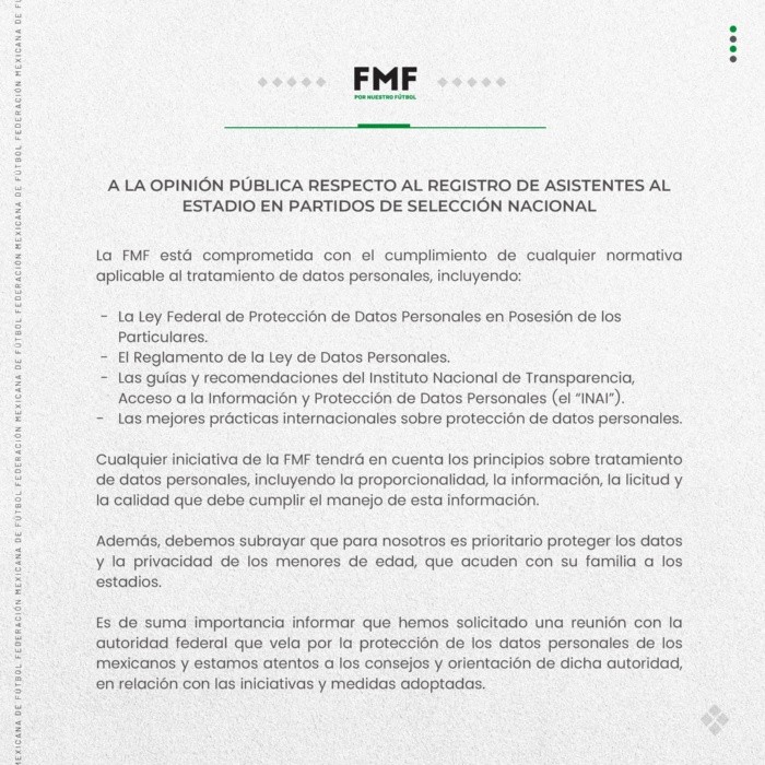 Se dio comienzo una investigación de oficio en contra de la Federación Mexicana de Futbol (FMF) por parte del Instituto Nacional de Transparencia, Acceso a la Información y Protección de Datos Personales (INAI).Por las medidas que se implementaron en los estadios a raíz de la riña en Querétaro. Las cuales se pusieron a prueba durante el partido México vs Estados Unidos el pasado 24 de marzo.El comisionado del INAI, Francisco Javier Acuña, dice que se tenía que haber solicitado una evaluación sobre el impacto que puede causar estas medidas a implementar por el protocolo usado por la FMF para el Fan ID. pero hasta el momento no se han acercado. Sólo han mandado una carta solicitando una cita.Asegura que dichas medidas son demagógicas, autoritarias y desproporcionadas y convierten a los aficionados prácticamente en reos. También el director general Luis Fernando García comenta que no se puede garantizar que las instituciones sean capaces de cuidar la información personal, así como generar graves equivocaciones con el uso del reconocimiento facial. Menciona también que este tipo de medida es propia de regímenes autoritarios y prohibida en muchas partes del mundo por los errores en que caen los sistemas y la discriminación que puede provocar.MV