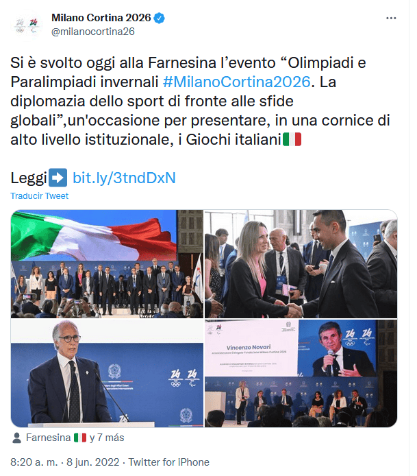 "La apuesta que ganamos en 2019 contra todo pronóstico nos obliga a hacerlo todo muy bien y a organizar los mejores Juegos de la historia. Tiene que ser así, ya que, después de tantas ediciones, los Juegos Olímpicos de Invierno volverán a Europa, su cuna, y porque nuestro mensaje dará al COI (Comité Olímpico Internacional) la oportunidad de aumentar el horizonte del territorio implicado", dijo Giovanni Malagò, presidente del Comité Olímpico Italiano (CONI).