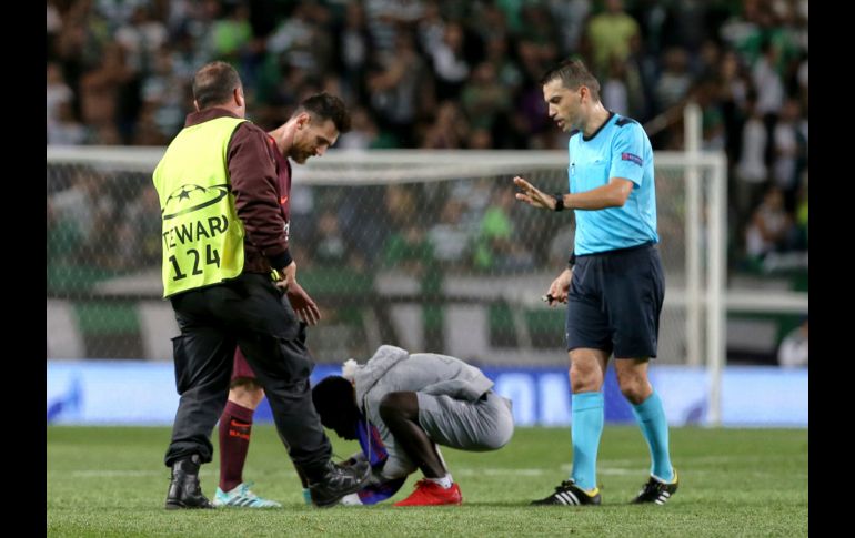 A pesar de que el Barcelona no dio su mejor demostración de futbol hoy ante el Sporting de Portugal, eso no impidió que un aficionado saltara a la cancha para abrazar a Lionel Messi y besar sus botines.En imágenes difundidas por la televisión se observa a un joven abrazar al jugador argentino, que intercambia palabras con el aficionado y le toca la cabeza antes de que el espontáneo se incline para besar los zapatos del atacante.Para compensar por la excesiva muestra de efusividad el público del Sporting, club del que surgió Cristiano Ronaldo, comenzó a corear el nombre del astro del Madrid.El argentino causó estupor en su visita a Portugal. El entrenador del Sporting lo tildó de "extraterrestre" y Récord, uno de los principales diarios deportivos del país lo recibió con el titular "Bienvenido señor Messi".