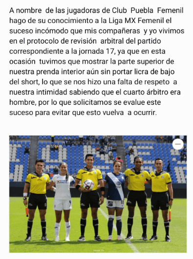La capitana del equipo femenil de Puebla, María José López, hizo un llamado de atención hacia el arbitraje del juego contra Cruz Azul, pues asegura "les faltaron al respeto" a las jugadoras de la franja.La jugadora del Puebla hizo un llamado a las autoridades de la Liga MX vía redes sociales, al solicitar una evaluación de la situación que vivieron en el duelo de la fecha 17 contra la Máquina en el Estadio Cuauhtémoc, pues asegura que el protocolo de revisión previo al encuentro no fue el adecuado."A nombre de las jugadoras del Club Puebla Femenil hago de su conocimiento a la Liga MX Femenil el suceso incómodo que mis compañeras y yo vivimos en el protocolo de revisión arbitral del partido correspondiente a la jornada 17", solicitó la jugadora.Y explicó que "en esta ocasión tuvimos que mostrar la parte superior de nuestra prenda interior aún sin portar licra debajo del short, lo que se nos hizo una falta de respeto a nuestra intimidad sabiendo que el cuarto árbitro era hombre, por lo que solicitamos se evalue este suceso para evitar que esto vuelva a ocurrir".Por este actuar, el club solicitó a la Liga, también por medio de un comunicado, que se abra una investigación al cuarto árbitro Édgar Pablo Villa, por lo ocurrido en este previo, esperando que no pase desapercibido. AJ