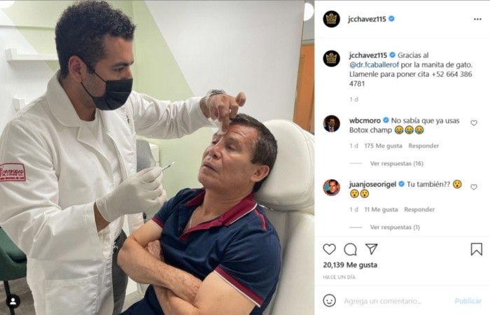 La leyenda del boxeo, Julio César Chávez, ha sido criticado por sus aficionados luego de presumir una fotografía en donde se está aplicando botox, situación que no le pareció a muchos. Algunos expresaron su decepción al ver a un "ídolo caído", o de no ver al "Gran Campeón Mexicano"’ envejecer con gracia y orgullo.Otros aprovecharon para hacer comentarios sarcásticos y burlas, como el mismo presidente del Consejo Mundial de Boxeo, Mauricio Sulaimán, quien escribió, "No sabía que ya usas Botox, champ".Ante esto, Julio César Chávez se expresó contra sus críticos en redes sociales, "A cómo chingan jajaja con que me puse Botox con todo respeto a todos esos que critican seguramente hasta operados están que digo Botox jajaja lo pasa es que a mi me vale madres y yo si digo las cosas jajaja saludos".Chávez decidió colgar los guantes el pasado 18 de julio cuando enfrentó en una pelea de exhibición a Macho Camacho Jr., en Guadalajara.JM