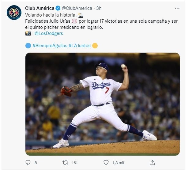 Si bien, todavía no es favorito para quedarse con el Cy Young, el pitcher mexicano Julio Urías sigue demostrando su calidad y ganando seguidores como partidos.Ayer, el lanzador de los Dodgers obtuvo su triunfo 17 de la temporada, luego de una magistral salida ante los Padres de San Diego, en la que trabajó siete entradas en blanco, recetó el mismo número de ponches, permitió tres hits y otorgó un pasaporte.Trabajo que le permite colocarse como líder solitario de victorias en la Gran Carpa. "Era muy importante ponernos adelante en esta serie", declaró Urías. "A nivel personal, grandioso conseguir esas victorias".En México, su equipo no se olvidó de él y lo felicitó por su gran labor con el equipo angelino. Las Águilas del América reconocieron su victoria número 17 de la temporada."Felicidades Julio Urías por lograr 17 victorias en una sola campaña y ser el quinto pitcher mexicano en lograrlo", escribió en sus redes sociales el cuadro azulcrema."Es un abridor de primera línea y cuando sube al montículo esperamos ganar", declaró el manager Dave Roberts. "Trabajar largo trecho esta noche muestra su desarrollo y madurez". El zurdo no pierde desde el 21 de junio en San Diego. Si quieres tener más contenido, más imágenes y aún más noticias, entonces descarga INFORMAPlus, la aplicación digital de EL INFORMADOR, donde tenemos materiales exclusivos para tí.Descarga la aplicación y pruébala GRATIS por treinta días. Para iOS: https://apple.co/35jaVgbPara Android: https://bit.ly/3gwVSEVSi eres suscriptor de EL INFORMADOR tu acceso está incluido, solicítalo al 33 3678-7777JL
