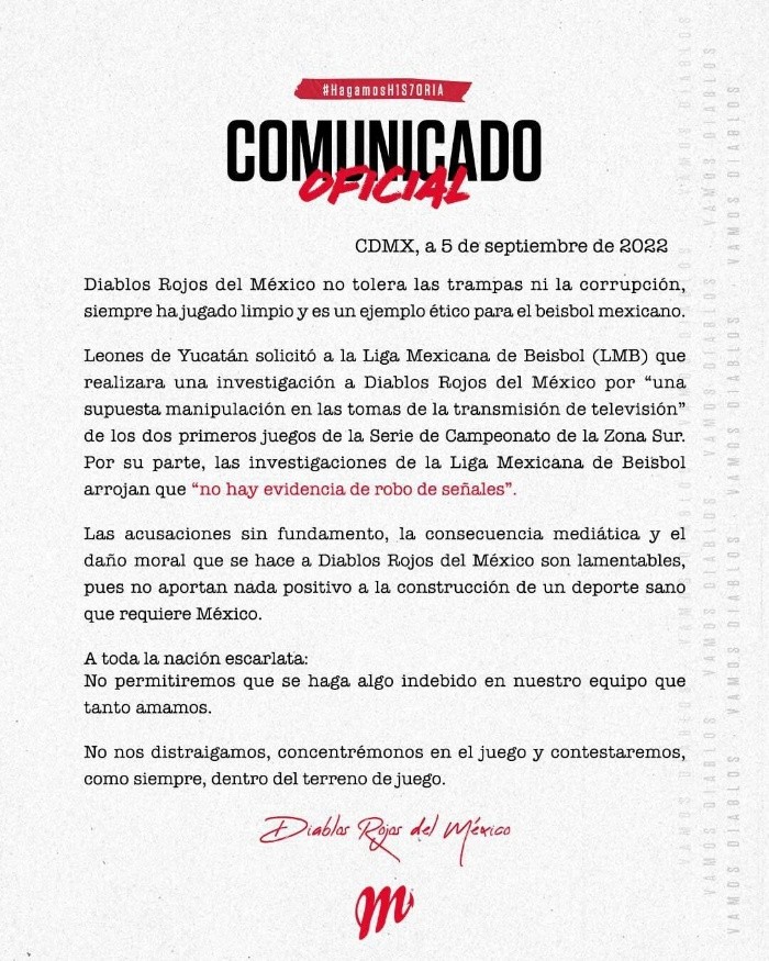 En las últimas horas, ha crecido la polémica en torno a los Diablos Rojos del México, quienes disputan la Final de la Zona Sur ante los Leones de Yucatán, luego de que trascendiera una supuesta manipulación de imágenes por parte de la novena mexiquense.El escándalo surge, luego de que durante los Juegos 1 y 2 de la serie, el productor de la trasmisión televisiva desarrolló tomas que exhibían a los lanzadores de los Melenudos y en redes han surgido los rumores de que con esto se robaron las señales. Por estos hechos, se tomó la decisión de sancionar a Marco Antonio Ávila Toledo, productor de televisión de los Diablos Rojos, y Miguel Ojeda Siqueiros, director deportivo de la franquicia.Este lunes mediante un comunicado en sus redes sociales, los Diablos Rojos del México negaron las acusaciones sobre el uso indebido de las cámaras de vigilancia y condenaron los actos de trampa y corrupción en el beisbol.Los Escarlatas agregaron que después de la investigación solicitada por Leones de Yucatán, las instituciones no encontraron alguna prueba o evidencia de alguna acción que beneficiara sus intereses.Los Diablos Rojos del México terminaron mostrando su inconformidad ante las acusaciones y daño moral, misma que no ayudan a la creación de un deporte sano.JL