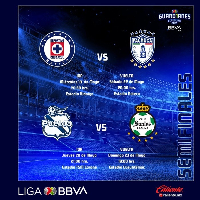 Inicia la semana de Semifinales de la Liga MX en su Torneo Guard1anes 2021 y este lunes se han hecho oficiales los horarios y días de los partidos de Ida y Vuelta de los duelos entre Cruz Azul ante Pachuca y Puebla frente a Santos Laguna.Por principio de cuentas, La Máquina, súper líder y gran favorito a llevarse el título, visitará este miércoles a los Tuzos del Pachuca que dejaron fuera al América en gran duelo. Este partido será en el Estadio Hidalgo a las 20:30 horas.Por su parte, Santos Laguna, quien dio la campanada al dejar fuera a Rayados de Monterrey, recibirá el jueves a las 21:00 horas a la Franja del Puebla, conjunto que se ha convertido en la “Cenicienta” del futbol mexicano.Los encuentros de Vuelta serán de la siguiente manera: Cruz Azul recibirá a Pachuca el sábado a las 20:00 horas con el Estadio Azteca como testigo, mientras que Santos pagará la visita a Puebla y visitará ahora el Estadio Cuauhtémoc a las 19:00 horas el próximo domingo.GC