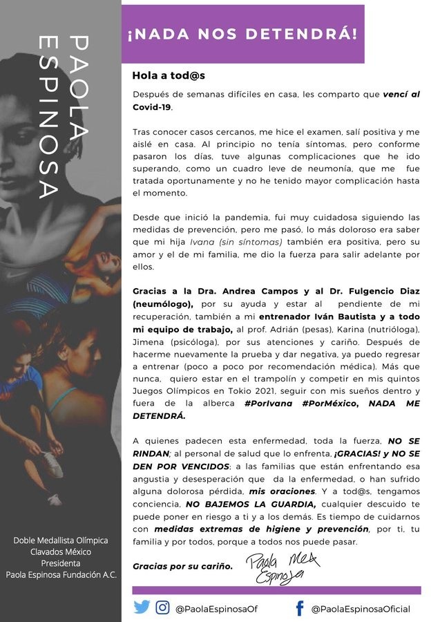 La mexicana Paola Espinosa, doble medallista olímpica de clavados, reveló este miércoles que padeció COVID-19, pero venció la enfermedad y ahora tiene más deseos que nunca de competir en sus quintos Juegos Olímpicos."Tras conocer casos cercanos, me hice el examen, salí positiva y me aislé en casa. Al principio no tenía síntomas pero conforme pasaron los días, tuve complicaciones que he ido superando, como un cuadro de leve pulmonía que me fue tratado y no he tenido mayor complicación", señaló la deportista en sus redes sociales.Campeona de la prueba de plataforma de 10 metros en los Mundiales de natación de Roma 2009, Espinosa conquistó la presea de bronce en los saltos por parejas en los Olímpicos de Beijing 2008 y mejoró a plata en esa misma especialidad en Londres 2012."Desde que inició la pandemia fui muy cuidadosa siguiendo las medidas de prevención, pero me pasó. Lo más doloroso es que mi hija Ivanna (sin síntomas) también era positiva, pero su amor y el de mi familia, me dio la fuerza para salir adelante", agregó.A los 34 años Espinosa se mantiene en una admirable forma deportiva; el año pasado, junto a su compatriota Melany Hernández, ganó la presea de bronce en clavados sincronizados en los Mundiales de Corea.En esa prueba la mexicana pretende asistir a sus quintos Juegos Olímpicos, en Tokio el próximo verano, en los que su deporte México tiene posibilidades de entrar en la disputa de por lo menos dos medallas.Los deportistas mexicanos se entrenan para por lo menos igualar en Tokio las cinco medallas conquistadas en los Olímpicos de Río de Janeiro.El país tendrá posibilidades de peleas por preseas en saltos, taekwondo, beisbol, pentatlón moderno, tiro deportivo y tiro con arco, entre otras disciplinas.OF
