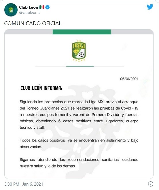 Falta muy poco para que la actividad futbolística en México comience, por eso todos los equipos realizan las pruebas de detección de coronavirus para poder competir. Esta vez, uno de los equipos que presentó contagios fue la escuadra campeona de la Liga MX, los Panzas Verdes del León.Se informó que el conjunto de La Fiera realizó las pruebas correspondientes a jugadores, cuerpo técnico y staff del primer equipo, la escuadra femenil e inferiores, de los cuales hubo cinco resultados positivos.Las personas afectadas ya se encuentran en aislamiento y bajo observación médica. Hace unas semanas el director técnico, Ignacio Ambriz, fue hospitalizado de forma preventiva por tener COVID-19 y tiene pocos días que retomó el trabajo con el conjunto campeón de la Liga MX.JM