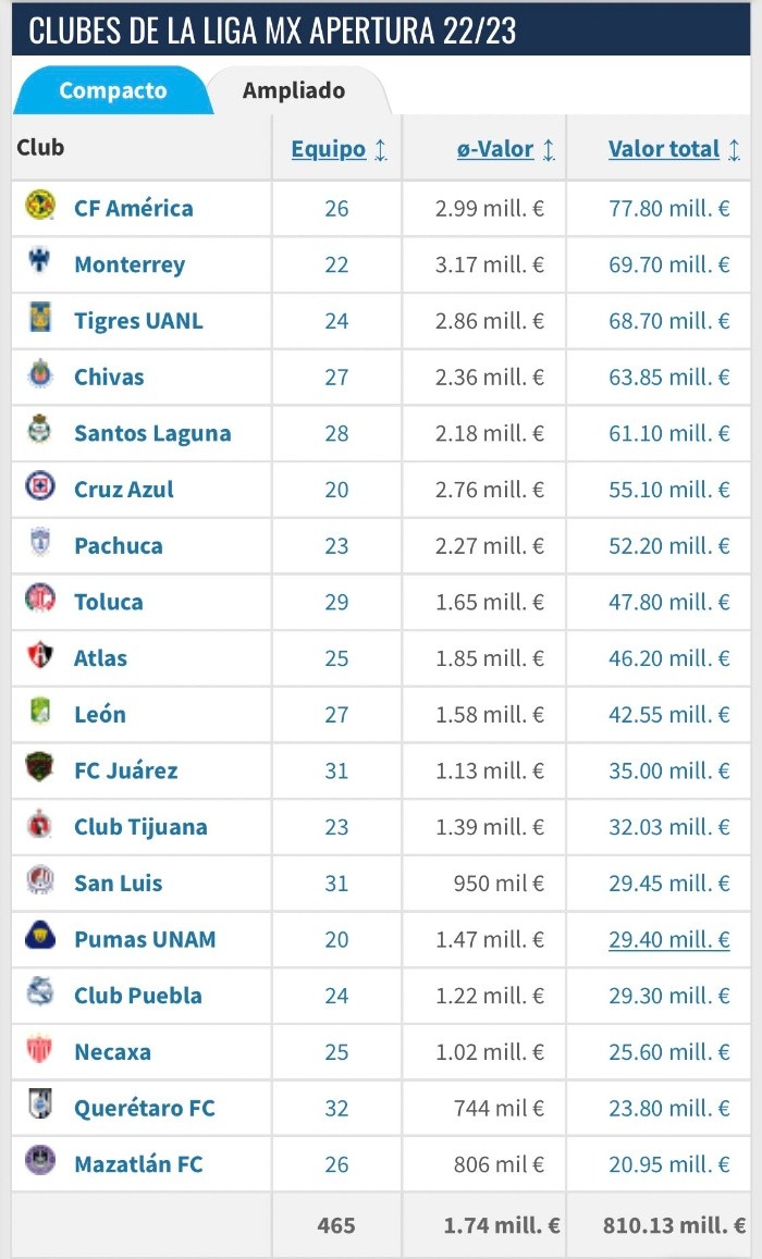 El reconocido portal Transfermarkt dio a conocer a través de su sitio oficial cuáles son los planteles más caros de la Liga MX de cara al Apertura 2022 y aunque en el top 3 se mantienen los mismos equipos de los últimos años, sí hay algunas novedades. Para la temporada 2022-2023, la plantilla más cara del futbol mexicano es la del Club América con un valor de 77.8 millones de euros. El top 3 lo completan los Rayados de Monterrey con un valor de 69.7 mde y los Tigres 68.7 mde. En el plano local, los clubes jaliscienses ocupan una buena posición. Por ejemplo, las Chivas son la cuarta plantilla más cara del futbol mexicano con un valor de 63.85 millones de euros. Atlas logra colarse en el top 10 ubicándose en la novena posición con un valor de 46.2 millones de euros. La plantilla con menos valor de la Liga MX es la del Mazatlán FC (20.95 millones de euros) y el valor de todos los equipos de la primera división del futbol mexicano da un total de 810.13 millones de euros. Como comparativa, ni siquiera el valor total de todos los equipos de la Liga MX alcanzaría para superar el valor del plantel del actual campeón de Europa, pues el Real Madrid tiene una de las plantillas más caras del mundo con un precio de 876 millones de euros. JL