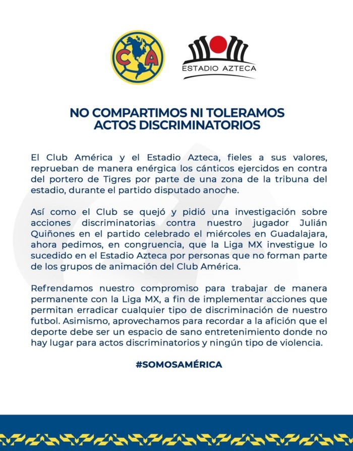 Este sábado en el duelo entre América y Tigres en el Estadio Azteca, Nahuel Guzmán, portero de los felinos, fue víctima de cánticos discriminatorios por parte de un sector de la afición en la cabecera norte.En plena transmisión de TUDN, el arquero argentino se acercó al reportero de cancha de Televisa, Gibran Araige, para decir que le parecía "desacertado" que un sector del público le lanzara cantos homofóbicos cuando "se busca un mensaje por la equidad e igualdad".Esta situación causó polémica y el América, en un acto de congruencia, ha solicitado mediante un comunicado a la Liga MX que investigue los cánticos hacia el "Patón", ayer en el triunfo (2-0) de las Águilas."Así como el club se quejó y pidió una investigación sobre acciones discriminatorias contra nuestro jugador Julián Quiñones en el partido en Guadalajara, ahora pedimos, en congruencia, que la Liga MX investigue lo sucedido en el Estadio Azteca por personas que no forman parte de los grupos de animación del Club América", lanzaron las Águilas mediante una misiva.El sector de aficionados que lanzó estos cánticos estaba compuesto por mujeres, ya que en el marco del Día Internacional de la Mujer, se dio el espacio de la cabecera norte a grupos femeninos. Situación que extrañó y molestó al portero de los Tigres.Por el momento, la Liga MX no ha lanzado su postura sobre lo sucedido anoche en el Coloso de Santa Úrsula.*Mantente al día con las noticias, únete a nuestro canal de WhatsApp aquí: https://whatsapp.com/channel/0029VaAf9Pu9hXF1EJ561i03MV