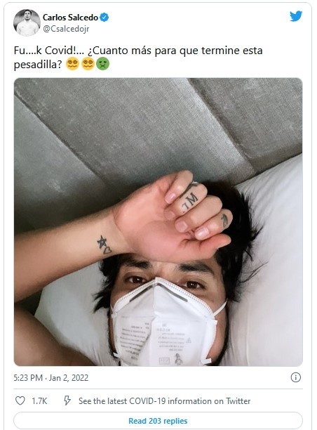 Carlos Salcedo informó en sus redes sociales que dio positivo a COVID-19.El futbolista escribió en su cuenta de Twitter, "Fu…k Covid!... ¿Cuánto más para que termine esta pesadilla?", su publicación la acompañó junto a una imagen donde se observa que porta el cubrebocas.Con el positivo que Salcedo son tres los futbolistas de Tigres que en una semana se contagian de coronavirus, primero fue Jesús Angulo y después Carlos González.De momento el club no ha informado más detalles sobre el estado de salud del defensa. Es la segunda ocasión que "El Titán" padece del virus, ya que en octubre de 2020 también dio positivo.JM