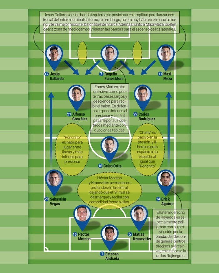 El camino para que Atlas ataque efectivamente al Monterrey esta noche es claro y definido.Los Rojinegros deben jugar la pelota a ras de pasto y avanzar por el centro de la cancha. Les explicó por qué.Los primeros siete minutos del partido, los Regios presionan la salida del rival a una intensidad alta, sin embargo, pasando ese lapso, Rogelio Funes Mori baja la calidad de su esfuerzo para defender hacia adelante y un central como Anderson Santamaría o Hugo Nervo, pueden dejarlo en el camino con una conducción rápida.Una vez en la zona del mediocampo, los tapatíos tienen otra ventaja ante los Rayados.Cuando un rival con balón dominado se acerca al sector central, “Ponchito” González y Charly Rodríguez saltan por el poseedor de la pelota y liberan grandes espacios a sus espaldas y a los costados de Celso Ortiz; éstos pueden ser aprovechados tanto por Jeremy Márquez al jugar entre líneas o bien con el ascenso diagonal de los laterales o descenso de los extremos, como Jairo Torres al centro de la cancha.Moreno y Kranevitter son muy estáticos en la zona central, no persiguen al delantero rival, con lo que Julio Furch o Julián Quiñones pueden desmarcarse para recibir con comodidad y girarse frente a la portería rival para intentar un disparo a puerta o descargar hacia los extremos para atacar desde la banda.Zona lateral izquierda ocupada por Sebastián Vegas, quien asciende en diagonal para buscar un posible remate.En caso que Duván Vergara ocupe el extremo izquierdo, el colombiano es más hábil en el mano a mano que Jesús Gallardo, además de que tiene una tendencia de ir al centro del campo y disparar de derecha.En defensa se encuentra en la zona donde se ubican Maxi Meza y Carlos Rodríguez; ambos son muy pasivos para presionar y permiten la circulación de balón al rival.El Monterrey sufre mucho cuando pierde la pelota y el rival realiza una transición rápida, sea mediante conducción o un pase largo.Rayados, utilizando ya sea a Rogelio Funes Mori o Vincent Janssen, busca continuamente desde las bandas a sus atacantes centrales, caracterizados por su fortaleza en el juego aéreo.“Ponchito” González le da a Monterrey la posibilidad de generar peligro mediante disparos de media y larga distancia.Maxi Meza juega muy bien de espaldas y continuamente es buscado para prolongar pelotas hacia los delanteros o bien, para Erick Aguirre en proyección.goles recibió en Fase Regular Esteban Andrada, quien tiene un muy hábil juego con los pies.gol en 17 jornadas registró Jairo Torres con Atlas, quien puede hacer daño a Rayados en el 1vs.1.JL