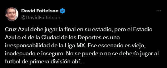 Esta semana se llevarán cabo los partidos de ida y de vuelta de la gran final del Torneo Clausura 2024 de la Liga MX, América vs Cruz Azul, el primero de los cuales se jugará en el Estadio Ciudad de los Deportes, mientras que el segundo será en el Estadio Azteca.Aunque existieron rumores de que ambos partidos se jugarían en el Coloso de Santa Úrsula, el director técnico del Cruz Azul aseguró que no se van a mover de su casa para jugar la final, en un inmueble que el periodista David Faitelson criticó fuertemente en redes sociales."Cruz Azul debe jugar la final en su estadio, pero el Estadio Azul o el de la Ciudad de los Deportes es una irresponsabilidad de la Liga MX. Ese escenario es viejo, inadecuado e inseguro. No se puede o no se debería jugar al futbol de primera división ahí…", publicó el conductor de Televisa.El partido de ida será el jueves 23 de mayo en el estadio Ciudad de los Deportes a las 20:00 horas.El juego de vuelta será el domingo 26 de mayo en el Estadio Azteca a las 19:00 horas.*Mantente al día con las noticias, únete a nuestro canal de WhatsAppOF