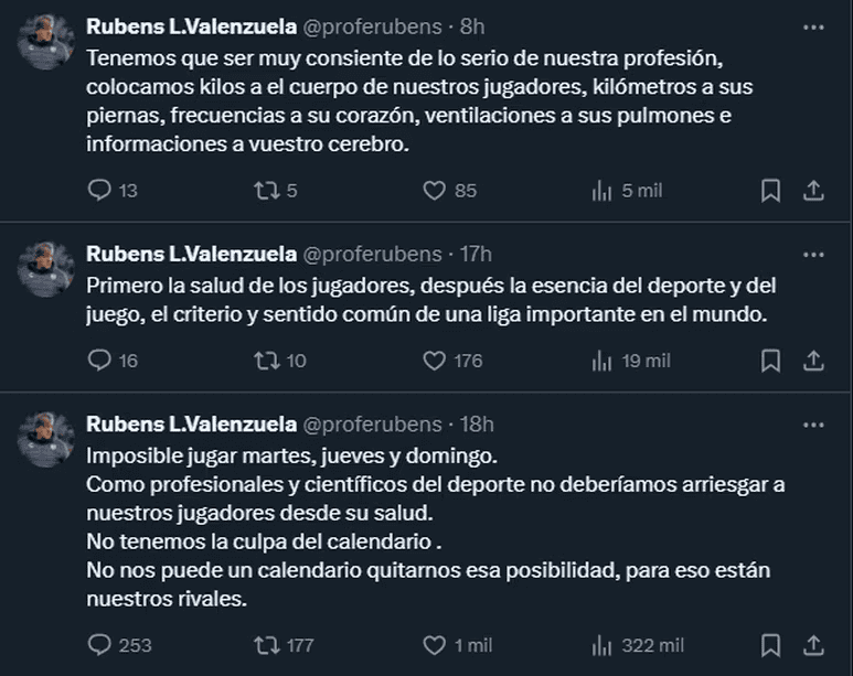 El Pachuca tendrá un calendario muy apretado en los siguientes días, por un lado enfrenta las semifinales de la Champions Cup de Concacaf contra el América, y por el otro disputará el Play-In de la Liga MX en el que buscará su lugar a los cuartos de final del Clausura 2024 el siguiente fin de semana contra los Pumas de la UNAM.Es decir, en cuestión de muy pocos días los Tuzos tendrán tres juegos de alta importancia para su futuro en ambas competencias.Esto mismo hizo explotar a Rubens Valenzuela, preparador físico del conjunto tuzo, quien desahogó su rabia en su cuenta de X (antes Twitter)."Imposible jugar martes, jueves y domingo. Como profesionales y científicos del deporte no deberíamos arriesgar a nuestros jugadores y su salud. No tenemos la culpa del calendario. No nos puede un calendario quitarnos esa posibilidad, para eso están nuestros rivales", fue la primera publicación que redactó al respecto.Más tarde comentó: "Primero la salud de los jugadores, después la esencia del deporte y del juego, el criterio y sentido común de una liga importante en el mundo".Y por último criticó la negligencia: "Tenemos que ser muy consciente de lo serio de nuestra profesión, colocamos kilos al cuerpo de nuestros jugadores, kilómetros a sus piernas, frecuencias a su corazón, ventilaciones a sus pulmones e informaciones a vuestro cerebro". ¿Cómo estará la agenda del Pachuca esta semana?El Pachuca de Guillermo Almada, como ya mencionamos, tienen mucho en juego esta semana, tanto en la Concachampions como en la Liga MX.El no haber accedido a la Liguilla de manera directa los obligó a buscar ese boleto desde el Play-In contra Pumas, por lo que así quedará su calendario:En caso de no vencer a los universitarios, tendría una última oportunidad, que se realizaría el jueves, ante el vencedor del juego entre el Necaxa y el Querétaro. ***Mantente al día con las noticias, únete a nuestro canal oficial de WhatsAppFA