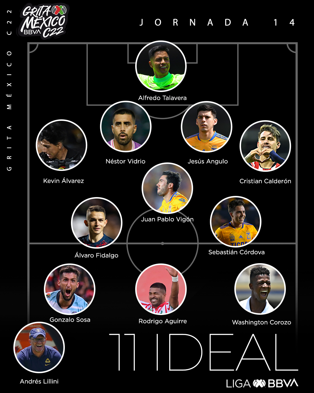 La Jornada 14 significó una alegría para las Chivas, luego de que sacaran una importante victoria en la cancha del Estadio Azteca ante Cruz Azul, de la mano de Ricardo Cadena, su entrenador interino tras la destitución de Marcelo Michel Leaño.Como es habitual al finalizar cada Jornada del Clausura 2022, la Liga MX compartió su once ideal y en esta ocasión un futbolista rojiblanco fue incluido. El gran artífice de la victoria del Rebaño fue Cristian "Chicote" Calderón, quien con un cabezazo en un tiro de esquina, puso el único tanto del partido y por ello la Liga MX determinó incluirlo en el once ideal de la Jornada 14. En la portería, el arquero de los Pumas y de la Selección Mexicana, Alfredo Talavera, se hizo presente. La defensa está conformada por Kevin Álvarez (Pachuca), Néstor Vidrio (Mazatlán), Jesús Angulo (Tigres), y Cristian Calderón (Chivas). El mediocampo está conformado por Álvaro Fidalgo (América) y por dos felinos, Juan Pablo Vigón y Sebastián Córdova (Tigres). En el ataque, Gonzalo Sosa (Mazatlán), Rodrigo Aguirre (Necaxa) y Washington Corozo (Pumas) fueron los elegidos para completar el once ideal de la Jornada 14 del Clausura 2022. JL