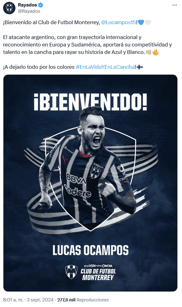 Un jugador más proveniente del futbol de España llega a reforzar a un equipo de la Liga MX, concretamente los Rayados de Monterrey. Lucas Ocampos, delantero de 30 años, se integrará al cuadro que dirige Martín Demichelis con altas expectativas por la carrera futbolística que lo respalda.Por medio de redes sociales, Monterrey anunció de manera oficial la contratación de Ocampos quien firmó un contrato hasta el 2027 y se convertirá en uno de los refuerzos más importantes del futbol mexicano por los logros que ha cosechado durante su trayectoria.El nacido en Quilmes, Argentina, inició su carrera a los 16 años con el River Plate. Fue parte del plantel que consiguió el ascenso a Primera División en 2012, y después de su destacada actuación, dio el salto a Europa con el AS Mónaco de Francia, conjunto con el que debutó en la Champions League.Para el 2015, pasó a las filas del Olympique de Marsella, donde fue dirigido por Marcelo Bielsa y también compartió vestidor con André-Pierre Gignac por un breve tiempo. Sin embargo, ambos atacantes se reencontrarán luego de nueve años en el próximo Clásico Regio a disputarse el 19 de octubre en el Estadio BBVA.También vistió las camisetas del Génova y AC Milán de Italia, Ajax de Holanda, pero su más reciente club y con el que cosechó sus dos máximos triunfos en el viejo continente fue con el Sevilla de España, pues ganó en dos ocasiones la Europa League. Además de que jugó más de 200 partidos en los que anotó 44 goles y brindó 22 asistencias.Ha sido seleccionado nacional con Argentina desde las categorías inferiores y participó con la Selección mayor en las eliminatorias rumbo a la Copa Mundial Qatar 2022.*Mantente al día con las noticias, únete a nuestro canal de WhatsAppOF