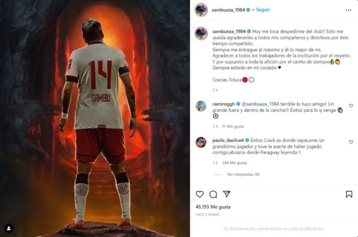 A través de su cuenta de Instagram, Rubens Sambueza anunció que terminó su etapa con los Diablos Rojos del Toluca. "Hoy me toca despedirme del club!! Solo me queda agradecerles a todos mis compañeros y directivos por éste tiempo compartido. Siempre me entregué al máximo y di lo mejor de mí", escribió el futbolista.Con 37 años de edad, el centrocampista argentino, naturalizado mexicano, finaliza por segunda ocasión la relación laboral con los Diablos Rojos.Sambueza había formado parte de los Choriceros del Clausura 2017 al Apertura 2018, salió de la institución y regresó al club para el Guard1anes 2020, ahora, tras finalizar el Apertura 2021 deja el club.En total Rubens vistió la playera del Toluca los últimos tres torneos, donde participó en 54 partidos, entre torneo regular y liguilla, acumulando cuatro mil 639 minutos y concretó ocho goles."Agradecer a todos los trabajadores de la institución por el respeto. Y por supuesto a toda la afición por el cariño de siempre, Siempre estarán en mi corazón, Gracias Toluca", fue la parte final de la publicación de Sambueza.JL