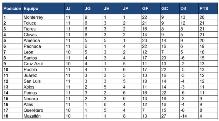 Los Rayados de Monterrey, que este domingo ganaron por 2-1 al campeón Pachuca, se consolidaron como líderes del Torneo Clausura 2023 del futbol mexicano, en tanto que Henry Martín, del América, encabeza a los goleadores, después de 11 jornadas.Monterrey llegó a nueve triunfos, un empate, una derrota y 28 puntos, siete más que Toluca, Tigres y Chivas, que cierran en ese orden el cuarteto en zona de clasificación directa a los cuartos de final.Este domingo, Toluca goleó 4-1 al Mazatlán. Los Diablos, que jugaron más de la mitad del duelo con un hombre más en la cancha, llegaron a seis victorias, con tres empates, dos derrotas y 21 unidades, las mismas que Tigres, vencido este sábado 0-2 por el América, y Chivas, superado el viernes 0-1 por el Puebla.Por América, Henry Martín se fue en blanco, pero siguió delante como líder de los goleadores con 10 tantos, dos más que el argentino Rogelio Funes Mori, del Monterrey.El viernes el brasileño Gustavo Ferrareis anotó un gol para que el Puebla venciera a Chivas y le cortara una racha de cuatro victorias seguidas.La jornada empezó el viernes, cuando, además de la victoria del Puebla sobre el Guadalajara, el San Luis derrotó por 2-0 al Querétaro con goles de Dieter Villalpando y el brasileño Vitor Ferreira.El sábado, antes del triunfo del América sobre Tigres, el chileno Víctor Dávila convirtió un gol para darle al León una victoria por 0-1 sobre Atlas, en tanto Jesús Escoboza guió al Cruz Azul a sumar tres puntos sobre los Pumas.En el otro partido de la jornada, el domingo el Necaxa empató 1-1 con el Juárez.El Clausura 2023 de la Liga MX continuará con la J12, del viernes al domingo próximos.NomenclaturaJJ Juegos Jugados JG Juegos Ganados JE Juegos Empatados JP Juegos Perdidos GF Goles a Favor GC Goles en Contra Dif Diferencia de Goles PTS Puntos* Participan automáticamente por el Título de Campeón de la LIGA MX en los Torneos Apertura 2021 y Clausura 2022, los doce primeros Clubes de la Tabla General de Clasificación de cada Torneo al término de las 17 Jornadas** Los Clubes clasificados en las posiciones 1, 2, 3 y 4 se ubicarán directamente en la fase de Cuartos de Final *** Los Clubes clasificados en las posiciones 5, 6, 7 y 8 jugarán en condición de local en los partidos de Reclasificación Local **** Los Clubes clasificados en las posiciones 9, 10, 11 y 12 jugarán en condición de visitante en los partidos de Reclasificación VisitanteCon información de EFEOF