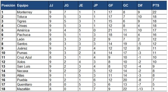 El colombiano Duván Vergara anotó el lunes un penalti en el minuto 84 para rescatar un empate del Monterrey, 1-1 ante León, que le sirvió a los Rayados para confirmarse como líderes del Torneo Clausura 2023 de la Liga MX.El argentino Lucas Di Yorio convirtió con un golpe de derecha cruzado en el minuto 14, a pase del colombiano Jaine Barreiro, después de lo cual el León manejó bien la ventaja.En la parte final del encuentro Vergara anotó el empate y afirmó al Monterrey en el primer lugar con siete triunfos, un empate, una derrota y 22 puntos, cuatro encima de Toluca, Tigres y Chivas, sus más cercanos perseguidores.Este domingo el chileno Jean Meneses y el paraguayo Carlos González anotaron por el Toluca, que venció por 2-0 al San Luis y, sin ruido, saltó al segundo lugar por mejor diferencia de goles que Tigres y Chivas.El sábado, en uno de los duelos más esperados de la jornada, la Chivas del Profe Pauno vencieron por 2-1 a los Tigres en su propio estadio y le quitaron el invicto, además de subir al cuarto lugar general.Gilberto Sepúlveda y Ronaldo Cisneros anotaron por Chivas y el argentino Nicolás Ibáñez lo hizo por los derrotados.En uno de los resultados más llamativos de la fecha nueve del campeonato, los argentinos Lisandro López y Alexis Canelo convirtieron este domingo un gol cada uno para darle a Xolos un triunfo por 2-0 sobre el campeón Pachuca.Pachuca comenzó mejor, pero después de 25 minutos los Xolos de Miguel Herrera impusieron condiciones y lo reflejaron en el marcador.En el minuto 26 López remató de zurda al ángulo para el 1-0 en favor del cuadro de casa, que en el 30 aumentó la ventaja, con un disparo de diestra de Canelo en un error del guardameta argentino Óscar Ustari.En los otros duelos sabatinos, Cruz Azul derrotó por 1-0 al Juárez FC, y el uruguayo Brian Lozano se ratificó como uno de los jugadores más virtuosos del futbol mexicano, al anotar dos elegantes goles de larga distancia para darle al Atlas un empate 2-2 contra el América.Lozano anotó dos veces por Atlas, en tanto por América anotaron el uruguayo Jonathan Rodríguez y el mexicano Henry Martín, quien se consolidó como líder de los goleadores con 10 tantos.La novena jornada comenzó el viernes, cuando los Pumas se impusieron por 2-1 al Mazatlán, con anotaciones de los argentinos Eduardo Salvio y Juan Ignacio Dinenno, en tanto por los derrotados descontó el colombiano Nicolás Benedetti.Antes el Querétaro sacó un empate 1-1 en el estadio del Necaxa, con gol del colombiano Christian Rivera.En otro duelo, el domingo el Santos Laguna venció por 3-2 al Puebla.El Clausura 2023 continuará de viernes a domingo próximos con la J10.NomenclaturaJJ Juegos Jugados JG Juegos Ganados JE Juegos Empatados JP Juegos Perdidos GF Goles a Favor GC Goles en Contra Dif Diferencia de Goles PTS Puntos* Participan automáticamente por el Título de Campeón de la LIGA MX en los Torneos Apertura 2021 y Clausura 2022, los doce primeros Clubes de la Tabla General de Clasificación de cada Torneo al término de las 17 Jornadas** Los Clubes clasificados en las posiciones 1, 2, 3 y 4 se ubicarán directamente en la fase de Cuartos de Final *** Los Clubes clasificados en las posiciones 5, 6, 7 y 8 jugarán en condición de local en los partidos de Reclasificación Local **** Los Clubes clasificados en las posiciones 9, 10, 11 y 12 jugarán en condición de visitante en los partidos de Reclasificación VisitanteCon información de EFEOF