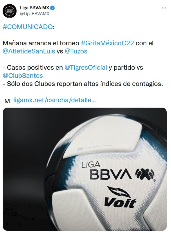 Mañana 6 de enero inician las actividades de la Liga MX, en el Torneo Clausura 2022, con el partido de la Jornada 1 (J1)Atlético San Luis vs Pachuca, y el sábado 8 de enero estaba programado para jugarse el encuentro Santos vs Tigres que, según se informó en un comunicado, fue reprogramado de último momento tras detectarse varios casos positivos de COVID-19.La Liga MX señaló que "En el caso específico del Club Tigres, de acuerdo a lo que establece el Protocolo Sanitario de la LIGA MX, entre el 31 de diciembre y el miércoles 5 de enero se han realizado 80 pruebas de COVID-19 a los jugadores registrados en el primer equipo, detectándose 12 casos positivos activos al día de hoy".Por lo que "con base en lo que indican los acuerdos en cuanto a la reprogramación de partidos y los tiempos de recuperación de los jugadores", en conjunto con los equipos, se "determinó reagendar el partido dentro de la misma Jornada 1 para el próximo miércoles 12 de enero en el Estadio TSM Corona con horario por definir".El partido Pumas vs Toluca del domingo se encuentra en revisión, y será mañana cuando se determine si se reprogramará o se jugará ese día a las 12:00 horas, como se tiene agendado.El resto de los partidos de la J1 son FC Juárez vs Necaxa, Puebla vs América, Monterrey vs Querétaro, Cruz Azul vs Xolos y Chivas vs Mazatlán. El duelo León vs Atlas se pospuso al 19 de enero al haber sido los equipos que jugaron la final del torneo Apertura 2021 y haber tenido menos tiempo de preparación.OF