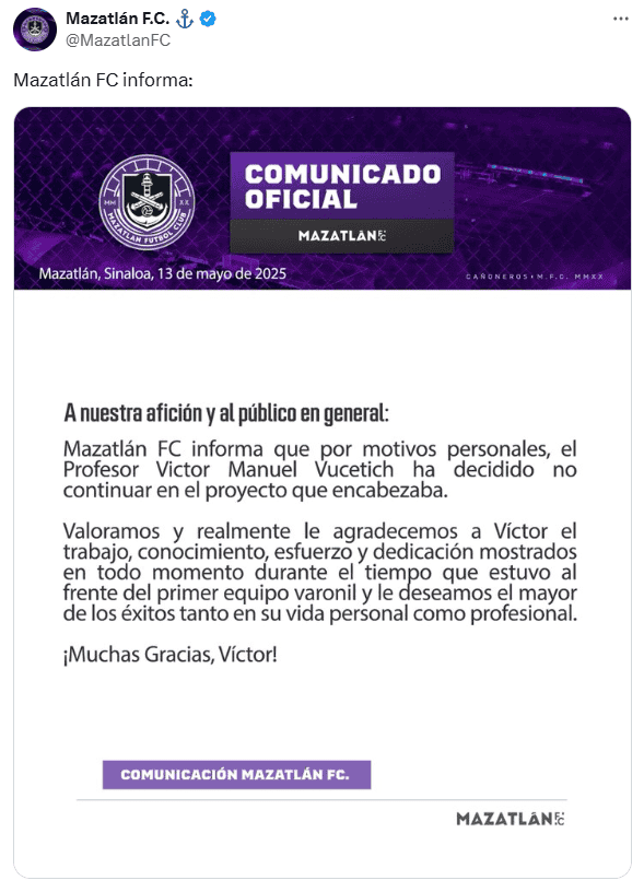 Tras haber cumplido apenas un año al frente del equipo, Víctor Manuel Vucetich tomó la decisión de renunciar al Mazatlán de la Liga MX.El "Rey Midas" llegó a los Cañoneros con la complicada misión de sumar puntos en la tabla porcentual, para evitar el pago de la multa, sin embargo, bajo su gestión, el equipo de La Perla del Pacífico únicamente pudo acumular 31 unidades: 14 en el Apertura 2024 y 17 en el Clausura 2025.De esta manera, el equipo mazatleco tuvo que desembolsar 80 millones de pesos, al no poder superar el tema del cociente.Ser el lugar 14 y 16 de la clasificación general, respectivamente, no ayudó en los números y Mazatlán FC terminó en el fondo de la porcentual, por detrás del Puebla y del Atlas.Sin embargo, la directiva de los Cañoneros decidió no despedir Víctor Manuel Vucetic, al finalizar el Clausura 2025.Aunque, el propio "Rey Midas" fue el que optó por abandonar el barco, de cara al próximo torneo de la Liga MX.A través de un comunicado, la directiva del conjunto de Sinaloa compartió que el cinco veces ganador del trofeo del futbol mexicano no se mantendría al frente del primer equipo."Mazatlán FC informa que, por motivos personales, el profesor Víctor Manuel Vucetich ha decidió no continuar en el proyecto que encabezaba", publicó en sus redes sociales.No obstante, los Cañoneros agradecieron los dos torneos que estuvieron bajo el mando del director técnico multicampeón de la Liga MX."Valoramos el trabajo, conocimiento, esfuerzo y dedicación mostrados en todo momento durante el tiempo que estuvo al frente del primer equipo varonil", manifestaron.Para finalizar, el Mazatlán FC le deseó a Víctor Manuel Vucetich "el mayor de los éxitos tanto en su vida personal como profesional".*Mantente al día con las noticias, únete a nuestro canal de WhatsAppOF