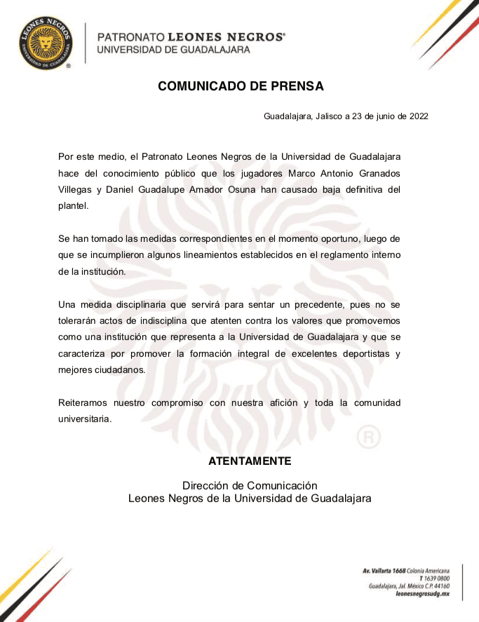 La disciplina no es algo negociable en una casa de estudios, y eso lo tienen claro en la Universidad de Guadalajara (UdeG). Muestra de esto fue que hoy los Leones Negros dieron de baja a dos de sus mejores jugadores por el incumplimiento de algunos reglamentos internos del equipo.Se trata del delantero Marco Antonio Granados y del mediocampista Daniel Amador, quienes a partir de ahora ya no forman parte de la institución tapatía."Una medida disciplinaria que servirá para sentar un precedente, pues no se tolerarán actos de indisciplina que atenten contra los valores que promovemos como una institución que representa a la Universidad de Guadalajara y que se caracteriza por pormover la formación integral de excelentes deportistas y mejores ciudadanos", publicó la directiva melenuda en un comunicado.Granados, de pasado rojiblaco por su paso con Chivas, se había convertido en uno de los mejores delanteros de la Universidad, esto mientras que Amador vivía una nueva etapa con los melenudos después de jugar en Primera División con el Mazatlán.JL