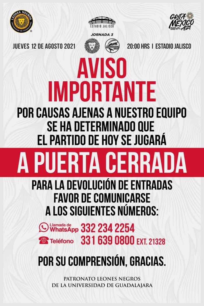 La Universidad de Guadalajara cerrará las puertas del Estadio Jalisco para el partido de este jueves ante Dorados de Sinaloa, así lo informó este día el Patronato de los Leones Negros.Ante esta situación, el equipo melenudo anunció que devolverá las entradas a quienes compraron su boleto para este partido, y los interesados deberán comunicarse al teléfono 3322342254.Aunque no se dio a conocer el motivo de esta decisión, la Universidad de Guadalajara pudo haber llegado a esta determinación debido al incremento de contagios de COVID-19.Será en punto de las 20:00 horas cuando Leones reciba a Dorados como parte de la Jornada 3 del Apertura 2021 de la Liga de Expansión. Si quieres tener más contenido, más imágenes y aún más noticias, entonces descarga INFORMAPlus, la aplicación digital de EL INFORMADOR, donde tenemos materiales exclusivos para tí.Descarga la aplicación y pruébala GRATIS por treinta días. Para iOS: https://apple.co/35jaVgbPara Android: https://bit.ly/3gwVSEVSi eres suscriptor de EL INFORMADOR tu acceso está incluido, solicítalo al 33 3678-7777JL
