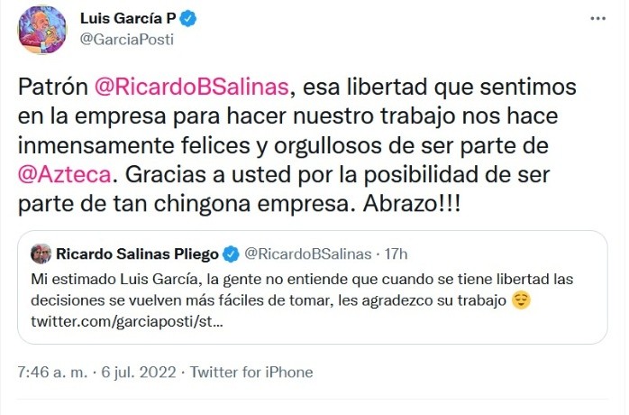 TV Azteca tuvo un arranque complicado durante el inicio del torneo Apertura 2022 luego de que perdiera los derechos de transmisión de los juegos de Necaxa y el FC Juárez, quedándose finalmente solamente con el Puebla y Mazatlán.Antes este panorama, y luego de percatarse de la falta de transmisiones de la Liga MX, un usuario de redes sociales le preguntó a Ricardo Salinas Pliego, dueño de la televisora del Ajusco, si permitiría que su dupla exitosa en comentarios deportivos, Christian Martinoli y Luis García, cambiaran de horizontes. Por supuesto, la respuesta del empresario no se hizo esperar, quien dio a entender que pueden salir a donde ellos quieran, ya que él "no los tiene amarrados", afirmó. Dichas declaraciones causaron mucha controversia, tanto que Luis García ya le contestó a Salinas Pliego y terminó con las especulaciones."Nunca nos vamos a ir. Nunca carajo", compartió el ex referente del balompié azteca en sus redes sociales. Esta respuesta la citó el mismo Ricardo Salinas, quien escribió "Mi estimado Luis García, la gente no entiende que cuando se tiene libertad las decisiones se vuelven más fáciles de tomar, les agradezco su trabajo".Cabe mencionar que tanto Luis García como Chrisitan Martinolli, Jorge Campos, y Luis Roberto Alvez, “Zague” han hecho un excelente trabajo en equipo que los han llevado a convertirse en los comentaristas favoritos del público en las transmisiones de fútbol.