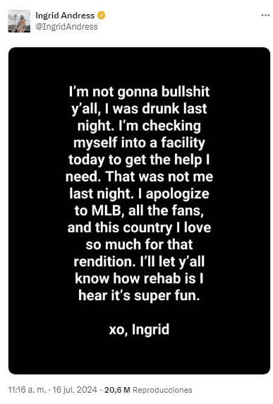 Tras una interpretación del himno nacional de Estados Unidos en el Home Run Derby de la MLB, que recibió muchas críticas, la cantante de country Ingrid Andress se disculpó ayer martes, admitiendo que estaba bajo los efectos del alcohol."Hoy me voy a internar en un centro para obtener la ayuda que necesito", escribió en una publicación de Instagram. "No era yo anoche. Pido disculpas a MLB, a todos los fanáticos y a este país que amo tanto por esa interpretación".El lunes por la noche, la cuatro veces nominada al Grammy cantó una versión a capella de "The Star-Spangled Banner", desde entonces los clips de su interpretación en el Globe Life Field en Arlington, Texas, han circulado en las redes sociales.El escritor de Sports Illustrated, Alex Carr, publicó en X: "Lo siento mucho, estoy seguro de que Ingrid Andress es una persona maravillosa, pero ese fue uno de los peores himnos nacionales que creo que he escuchado en toda mi vida".Andress, de 32 años, comenzó su carrera como compositora de Nashville, escribiendo canciones para intérpretes de todos los géneros como Bebe Rexha y Charli XCX.Firmó un contrato con Warner Music Nashville y Atlantic Records para su propia música, lanzando su álbum debut "Lady Like" en 2020 con un sencillo que alcanzó el número 30 en el Billboard Hot 100 y permaneció en la lista durante 20 semanas.En 2021, lanzó su segunda canción más grande hasta la fecha, alcanzando el número 47 de las listas de popularidad.Su segundo álbum, "Good Person", fue lanzado en el 2022.Esta no es la primera vez que se critica la interpretación del himno nacional; la interpretación de Roseanne Barr en un juego de los Padres de San Diego de 1990 y Fergie en el Juego de Estrellas de la NBA de 2018 provocaron reacciones similares. *Mantente al día con las noticias, únete a nuestro canal de WhatsAppOF
