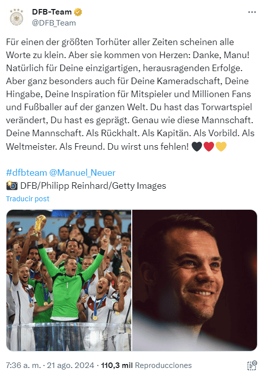 El portero Manuel Neuer anunció hoy miércoles 21 de agosto su retiro... de la Selección de Alemania, tras 15 años de trayectoria con el conjunto nacional. Mediante una emotiva carta publicada en sus redes sociales, el arquero del Bayern Munich expresó su decisión, calificándola como "difícil", y reflexionó sobre su paso por la "Mannschaft", donde llegó a ser capitán."Han pasado más de quince años desde mi debut en los Emiratos Árabes. Recuerdo ese día con nerviosismo. Estoy orgulloso de haber compartido tantos años con mis compañeros y de haber sido capitán durante siete años hasta que me lesioné. Me alegra que mi despedida haya sido en la Eurocopa disputada en mi país", declaró de manera nostálgica el portero.Manuel Neuer destacó la victoria en el Mundial de Brasil 2014 como "el punto culminante" de su carrera con la "Nationalelf", y agradeció a "todos los profesionales de la Federación, entrenadores de porteros, compañeros de equipo y aficionados" por los años compartidos. Con 124 duelos de carácter internacional, Neuer es el quinto jugador con más apariciones en la historia de la selección germana. Su debut ocurrió el 2 de junio de 2009, en un juego amistoso en los Emiratos Árabes, cuando todavía jugaba para el Schalke 04.Muy rápido se ganó la confianza del entrenador Joachim Löw, quien lo convirtió en titular para el Mundial de Sudáfrica 2010, consolidándose desde entonces como una pieza clave para la "Mannschaft".El "punto culminante" de su carrera, como él lo describe, llegó con la conquista del Mundial de Brasil en 2014, donde fue uno de los jugadores más destacados de Alemania y terminó en el tercer lugar para el Balón de Oro ese año.En 2016, tras la Eurocopa en Francia, tomó el gafete de capitán tras el retiro de Bastian Schweinsteiger. Neuer se quedó con el brazalete hasta 2023, cuando el nuevo seleccionador, Julian Nagelsmann, decidió entregárselo a Ilkay Gündogan, tomando como pretexto la lesión que había dejado al guardameta lejos de la actividad por un tiempo.A lo largo de su carrera con el representativo de futbol de Alemania, Neuer disputó cuatro Copas del Mundo y cuatro Eurocopas, siendo su última aparición en el torneo disputado en su propio país, donde el equipo anfitrión fue eliminado por España en cuartos de final.Con el retiro de Manuel Neuer, ya son cuatro los jugadores históricos que han dicho adiós a la Selección de Alemania tras la Eurocopa 2024. Entre ellos destacan Thomas Müller, Toni Kroos –quien además se retiró del futbol– y el propio Ilkay Gündogan.*Mantente al día con las noticias, únete a nuestro canal de WhatsAppOF