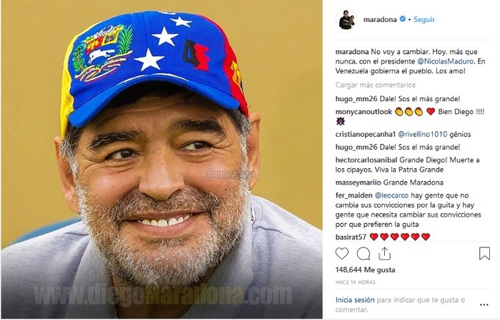 El campeón del mundo Diego Maradona expresó este jueves su apoyo al presidente venezolano, Nicolás Maduro, y para respaldarlo aseguró que "en Venezuela gobierna el pueblo", tras la jornada en la que el opositor Juan Guaidó se autoproclamó presidente del país."No voy a cambiar. Hoy, más que nunca, con el presidente Nicolás Maduro", dijo el ex futbolista argentino en su cuenta de la red social Instagram.Maradona acompañó el texto de una fotografía suya con una gorra con la bandera de Venezuela y una referencia al 4 de febrero, la fecha del primer golpe de Estado fallido del fallecido Hugo Chávez en 1992.El actual entrenador del Dorados de Sinaloa mexicano respaldó al Gobierno de Chávez en numerosas ocasiones en el pasado, así como al de Maduro, del cual afirmó que era "soldado" en 2017."En Venezuela gobierna el pueblo", añadió en su cuenta de Instagram Maradona, del que también es conocido su apoyo a la dictadura cubana y a otros gobiernos de ideología de izquierda.El presidente de la Asamblea Nacional venezolana, Juan Guaidó, se autoproclamó este miércoles presidente interino del país caribeño durante una jornada protestas multitudinarias contra el Gobierno de Nicolás Maduro, al considerar que dicho ejecutivo es ilegítimo.El gobierno estadounidense de Donald Trump respaldó la acción que llevó a cabo Guaidó minutos después de que este pronunciara su discurso, para el que se amparó en varios puntos de la Constitución venezolana.Trump advirtió este miércoles de que "todas las opciones están sobre la mesa" para responder en caso de que Maduro no acepte entregar el poder a Guaidó.Otros países de América, como Argentina, Brasil, Colombia y Chile, reconocieron a Guaidó como presidente legítimo, mientras que México reconoció a Maduro, algo que hicieron otros países como Turquía.La Unión Europea (UE), a su vez, expresó su "total apoyo" a la Asamblea Nacional de Venezuela como la institución elegida democráticamente en el país, y llamó a iniciar "inmediatamente" el proceso para celebrar unas elecciones "creíbles". OF