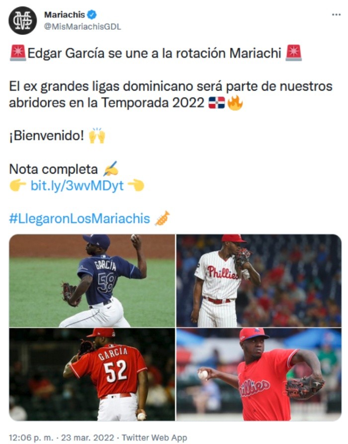 La novena tapatía fortaleció su cuerpo de pitcheo. Mariachis de Guadalajara hizo oficial la llegada del serpentinero Edgar García, quien viene de jugar en Grandes Ligas y llega a la Perla Tapatía para aportar toda su experiencia en el equipo jalisciense.El dominicano de 25 años de edad tendrá la responsabilidad de fortalecer la rotación abridora de Mariachis para la Temporada 2022 de la Liga Mexicana de Beisbol (LMB).García se une así al proyecto del manager Sergio Omar Gastélum, quien tiene contemplado al lanzador derecho como parte del staff de abridores extranjeros, donde también estarán el venezolano Henry Centeno y el estadounidense Matt Tenuta.El pitcher dominicano llega con grandes expectativas. Fue firmado desde 2014 por Philadelphia Phillies y con este equipo debutó en Grandes Ligas (MLB, por sus siglas en inglés) desde 2019. En 2020 pasó por Tampa Bay Rays y el año pasado lanzó para Cincinnati Reds y Minnesota Twins.En total registra 52 juegos de pelota caliente en la gran carpa y ahora buscará lucir con los Mariachis de Guadalajara en el circuito veraniego del beisbol mexicano.OF