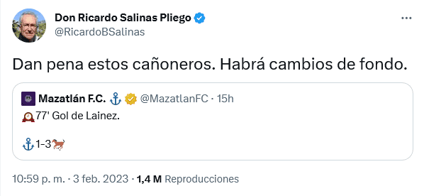 Mazatlán perdió 3-2 ante Juárez en la Jornada 5 del Clausura 2023, el resultado provocó que Ricardo Salina Pliego explotara contra su equipo en redes sociales.Ricardo Salinas Pliego se ha caracterizado en los últimos meses por ser muy activo en Twitter y en este medio manifestó su enojo por la situación que atraviesa Mazatlán."Dan Pena estos cañoneros. Habrá cambios a fondo", afirmó el también dueño de TV Azteca.Mazatlán en el Clausura 2023 ha disputado cuatro partidos, todos los ha perdido. La derrota más escandalosa fue la semana pasada cuando fueron goleados 6-0 ante América y que provocó la salida del técnico Gabriel Caballero, en total los Cañoneros ha recibido 13 anotaciones, mientas que han concretado cuatro.Aunque la racha negativa de resultados de Mazatlán comenzó desde el torneo pasado, el Apertura 2022, donde sólo ganó tres compromisos en las 17 jornadas.Mazatlán consiguió su última victoria el 7 de septiembre, cuando derrotó 1-0 al Atlas. Tras ese encuentro acumula 8 juegos sin poder ganar, cuatro en el Apertura 2022 y los otros cuatro en el presente Clausura 2023.OF
