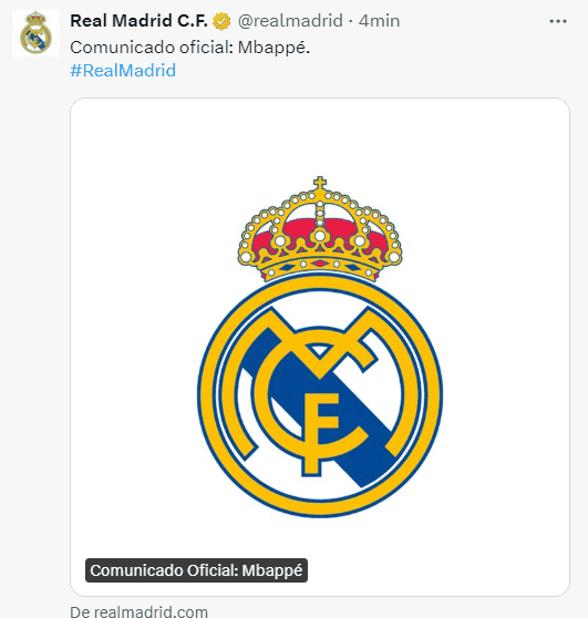 Este lunes 3 de junio, luego de varios años de rumores, Real Madrid confirmó que el delantero francés Kylian Mbappé es su nuevo jugador.El equipo merengue informó en un comunicado que Mbappé firmó por las próximas 5 temporadas.El atacante de la Selección de Francia y ex del PSG, llega al Real Madrid a los 25 años, después de ser durante varios cursos el gran objetivo, tras siete campañas en el equipo de París, y convertido en uno de los mejores futbolistas del mundo."El campeón de Europa se refuerza con una estrella mundial, que ha firmado su temporada más goleadora con el PSG (44 tantos) y ha sido el pichichi de las seis últimas Ligas francesas", resalta el Real Madrid en su comunicado. Además, junto con un video de goles de un futbolista letal, el conjunto resalta que refuerza su ataque con "un delantero espectacular" y pone en valor los logros de Mbappé, objeto de deseo desde hace años y que estuvo a un paso de firmar hace dos años con un cambio de opinión del jugador en el último momento para extender su vínculo con el PSG. *Con información de EFE*Mantente al día con las noticias, únete a nuestro canal de WhatsAppOF
