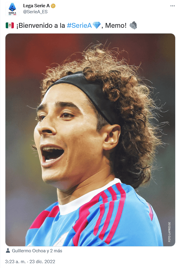 ¡Ya es oficial! Luego de que se informara la salida de Guillermo "Memo" Ochoa del América, la Serie A le dio la bienvenida este viernes al arquero tapatío, que firmó con el Salernitana por los próximos seis meses, hasta el final de la actual temporada."¡Bienvenido a la #SerieA, Memo!", publicó la cuenta de Twitter en español de la liga de futbol italiano.En un comunicado, el Salernitana dijo que "cerró un acuerdo con el arquero nacido en 1985 Guillermo Ochoa. El futbolista se comprometió con el club hasta el 30 de junio de 2023 con la posibilidad de renovación y lucirá el dorsal 13".Memo Ochoa disputó recientemente su quinta Copa del Mundo en Qatar 2022 con la Selección Mexicana.Tras haber debutado con las Águilas, Memo Ochoa viajó al futbol de Europa para jugar por tres temporadas en el Ajaccio de la Ligue 1 (en Francia), resalta el comunicado publicado en la página oficial del Salernitana. Luego resalta su paso por el futbol español, donde militó en el Málaga y el Granada, y luego en el Standard de Lieja del futbol de Bélgica.En 2019, el tapatío regresó a México con el América, y ahora formará parte del Salernitana de la Serie A, que en la actual campaña se ubica en el lugar 12 de la clasificación.OF