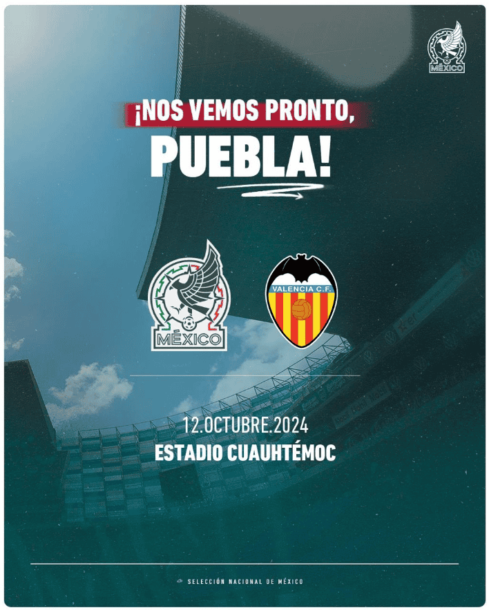 La Selección Mexicana sigue anunciando juegos de preparación con miras a la Copa del Mundo de 2026, y en este sentido este viernes se hizo oficial un nuevo cruce ante un rival europeo.Se trata del Valencia, escuadra que milita en LaLiga de España y que viajará a Puebla el próximo mes de octubre con tal de medirse a la Selección Nacional de México el próximo 12 de octubre en el Estadio Cuauhtémoc."Amigas y amigos, hoy me complace compartirles que el próximo 12 de octubre el Estadio Cuauhtémoc, casa del Club Puebla, será el escenario de un partido muy especial. En el marco de nuestra preparación para la Copa del Mundo del 2026, nuestra Selección Nacional recibirá al Valencia de LaLiga española. Esta es la oportunidad para ver a nuestros jugadores en contra de uno de los clubes con más tradición en España"."Estoy seguro que esto será una gran experiencia para la preparación de nuestra Selección Nacional, pero también para que nuestra afición del centro del país acompañe a nuestros jugadores", informó Ivar Sisniega, presidente ejecutivo de la Federación Mexicana de Futbol (FMF).Este juego en Puebla se llevará a cabo justo antes de que la Selección Mexicana visite Guadalajara (15 de octubre) para medirse contra los Estados Unidos en el Estadio AKRON.*Mantente al día con las noticias, únete a nuestro canal de WhatsAppOF