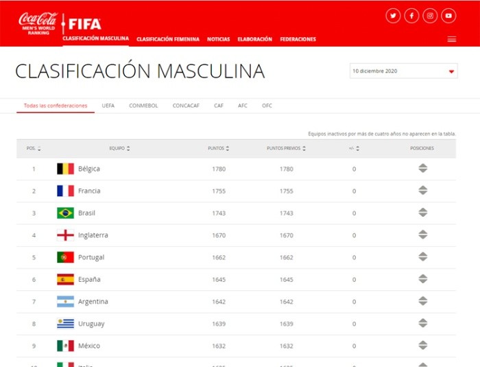 En un año en el que no se disputaron muchos partidos de futbol a nivel selecciones, debido a la pandemia, la FIFA presentó su último ranking de 2020, que es liderado por Bélgica y el que México se mantuvo en el Top-10 con relación al mes de noviembre.Bélgica sigue en el primer lugar de la clasificación de selecciones nacionales, por delante de Francia, Brasil e Inglaterra.Portugal ascendió al quinto puesto, delante de España y Argentina, mientras que Uruguay baja al octavo puesto, México se coloca noveno e Italia cierra el Top-10.La próxima Clasificación Mundial de la FIFA se publicará el 18 de febrero de 2021.Puedes revisar la clasificación completa aquí.OF
