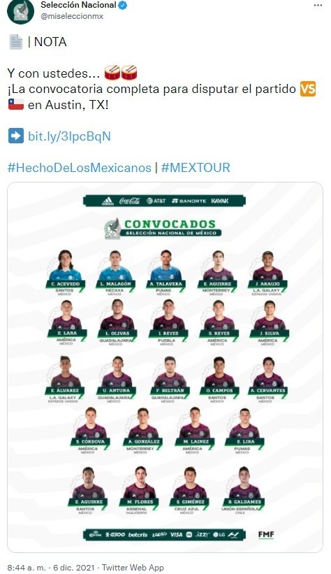 México enfrentará este miércoles 8 de diciembre a la Selección de futbol de Chile, en su último partido amistoso del 2021.En el juego a disputarse en Austin, Estados Unidos, debutarán 11 futbolistas en la Selección Mayor. Entre ellos destacan Benjamín Galdames, delantero del Unión Española de Chile, y Julián Araujo, mexicoamericano del Galaxy de Los Ángeles.Alfredo Talavera, Carlos Acevedo, Luis Malagón, Julián Araujo, Emilio Lara, Luis Olivas, Salvador Reyes, Israel Reyes, Jordan Silva, Erik Lira, Erick Aguirre, Uriel Antuna, Fernando Beltrán, Omar Campos, Alan Cervantes, Sebastián Córdova, Marcelo Flores, Arturo González, Eduardo Aguirre, Benjamín Galdames, Santiago Giménez, Mauro Lainez, Efraín Álvarez.IM