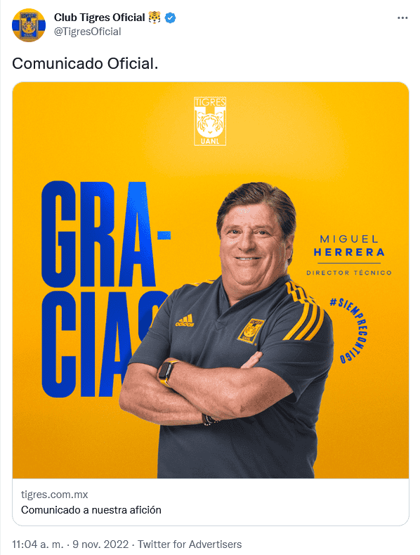 Tras los fracasos en donde no pudo coronarse y dejó al equipo tan solo cerca del objetivo, los Tigres han decidido que Miguel "Piojo" Herrera no es más el director técnico de los felinos y este miércoles le dieron las gracias."Después de realizar un análisis a profundidad, se ha tomado la decisión de finalizar la relación laboral con Miguel Herrera y su equipo de trabajo", dijo el club mediante un comunicado oficial.El Piojo Herrera estuvo al frente de los Tigres de la UANL a lo largo de tres torneos de la Liga MX, además de que estaba a punto de disputar una Concachampions, aunque desde el banquillo al estar suspendido por la CONCACAF cinco partidos.En su estancia en Nuevo León, el técnico mexicano dirigió 61 encuentros, ganando 31, empatando 13 y perdiendo 17, además de que siempre entró a la Liguilla, aunque nunca se pudo coronar. En los próximos días se dará a conocer el sustituto del Piojo en uno de los timones más calientes de toda la Liga MX.OF